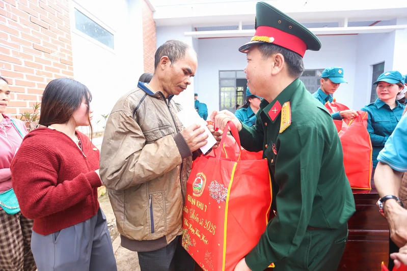 Đại tá Nguyễn Văn Lộc, Phó Chủ nhiệm Chính trị Quân khu tặng quà cho người dân.