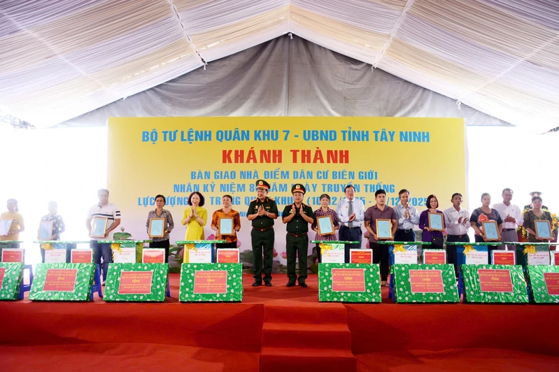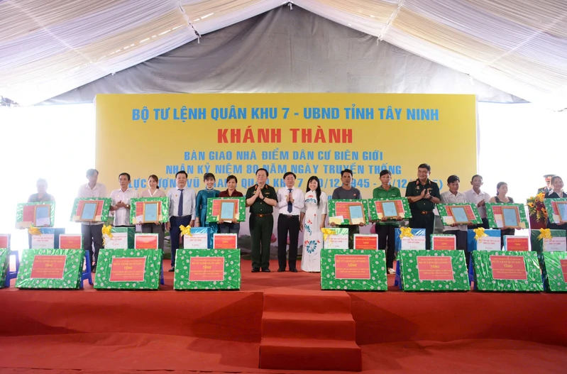 Đại tướng Nguyễn Trọng Nghĩa, Ủy viên Bộ Chính trị, Bí thư Trung ương Đảng, Ủy viên Thường vụ Quân ủy Trung ương, Chủ nhiệm Tổng cục Chính trị QĐND Việt Nam; thủ trưởng Bộ Tư lệnh Quân khu 7; lãnh đạo tỉnh Tây Ninh và đại biểu tặng quà các hộ dân được nhận nhà tại Điểm dân cư liền kề chốt dân quân biên giới.