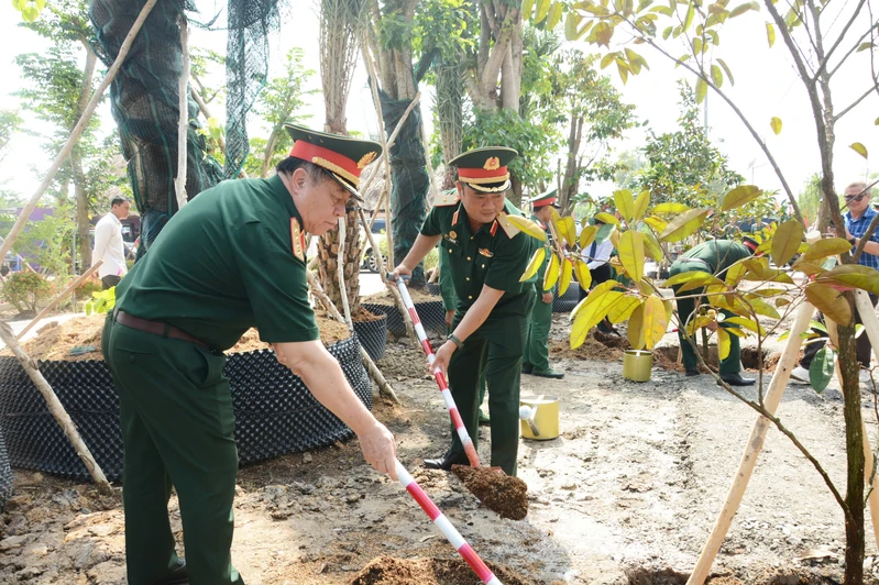 Đại tướng Nguyễn Trọng Nghĩa, Ủy viên Bộ Chính trị, Bí thư Trung ương Đảng, Ủy viên Thường vụ Quân ủy Trung ương, Chủ nhiệm Tổng cục Chính trị và Trung tướng Lê Xuân Thế, Ủy viên Trung ương Đảng, Tư lệnh Quân khu trồng cây lưu niệm tại Điểm dân cư biên giới ấp Giồng Nổi, xã Bình Thành, tỉnh Tây Ninh.