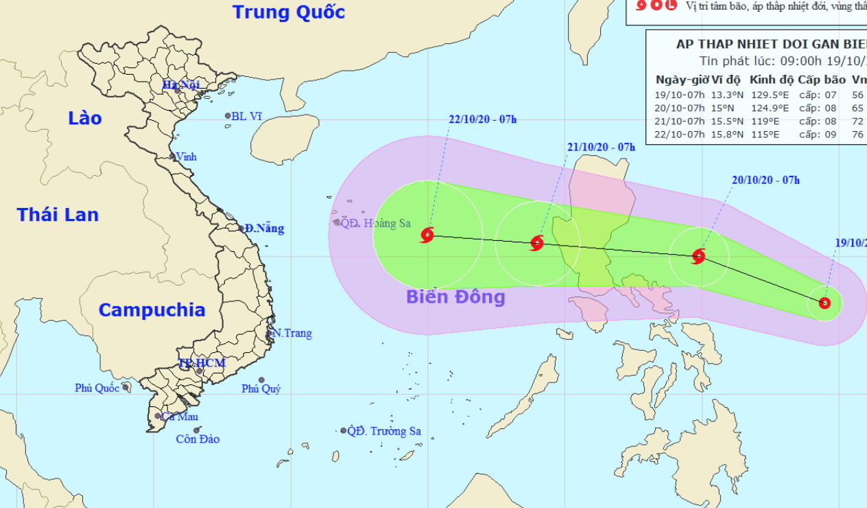 Dự báo trong 24 giờ tới, áp thấp nhiệt đới di chuyển theo hướng tây-tây bắc, mỗi giờ đi được khoảng 20 km và có khả năng mạnh lên thành bão. Đến 7h ngày 20/10, vị trí tâm bão ở khoảng 15,0 độ Vĩ Bắc; 124,9 độ Kinh Đông, cách đảo Luzon (Philippines) khoảng 350 km về phía đông-đông nam. Sức gió mạnh nhất vùng gần tâm bão mạnh cấp 8 (60-75 km/giờ), giật cấp 10.