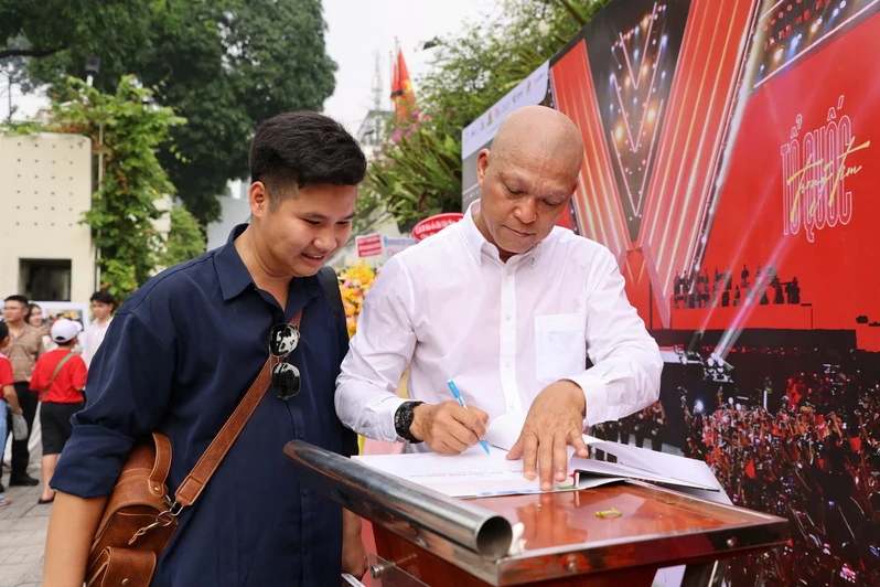 Nhiếp ảnh gia Nguyễn Á ký tặng sách ảnh cho phóng viên Nguyễn Lê Tiến, Báo Quân khu 7 (Ảnh: Nguyễn Hoàng).