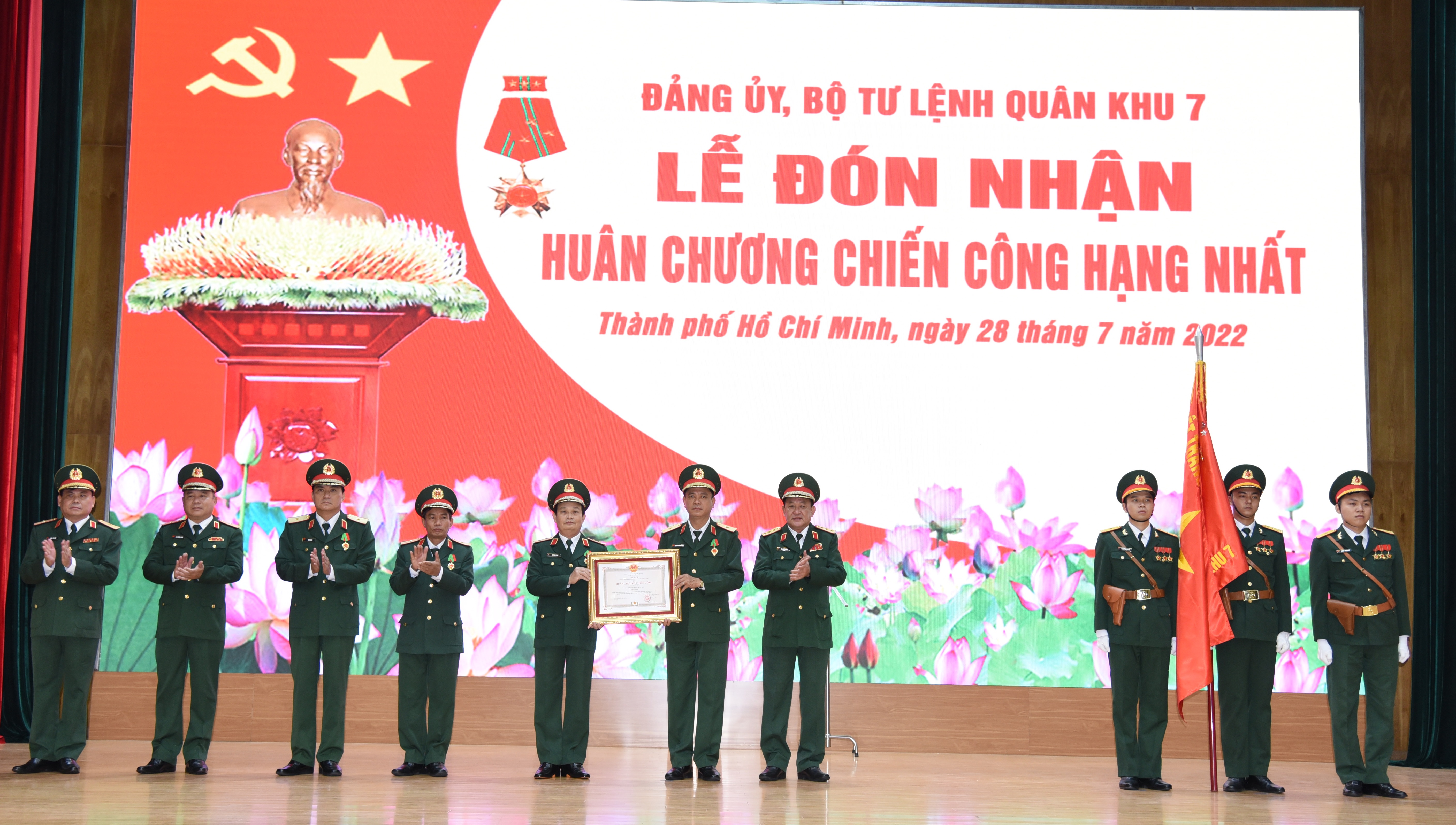 LLVT Quân khu 7 đón nhận Huân chương chiến công hạng Nhất vì đã lập chiến công đặc biệt xuất sắc trong thực hiện nhiệm vụ phòng, chống dịch Covid-19, góp phần vào sự nghiệp xây dựng CNXH và bảo vệ Tổ quốc.