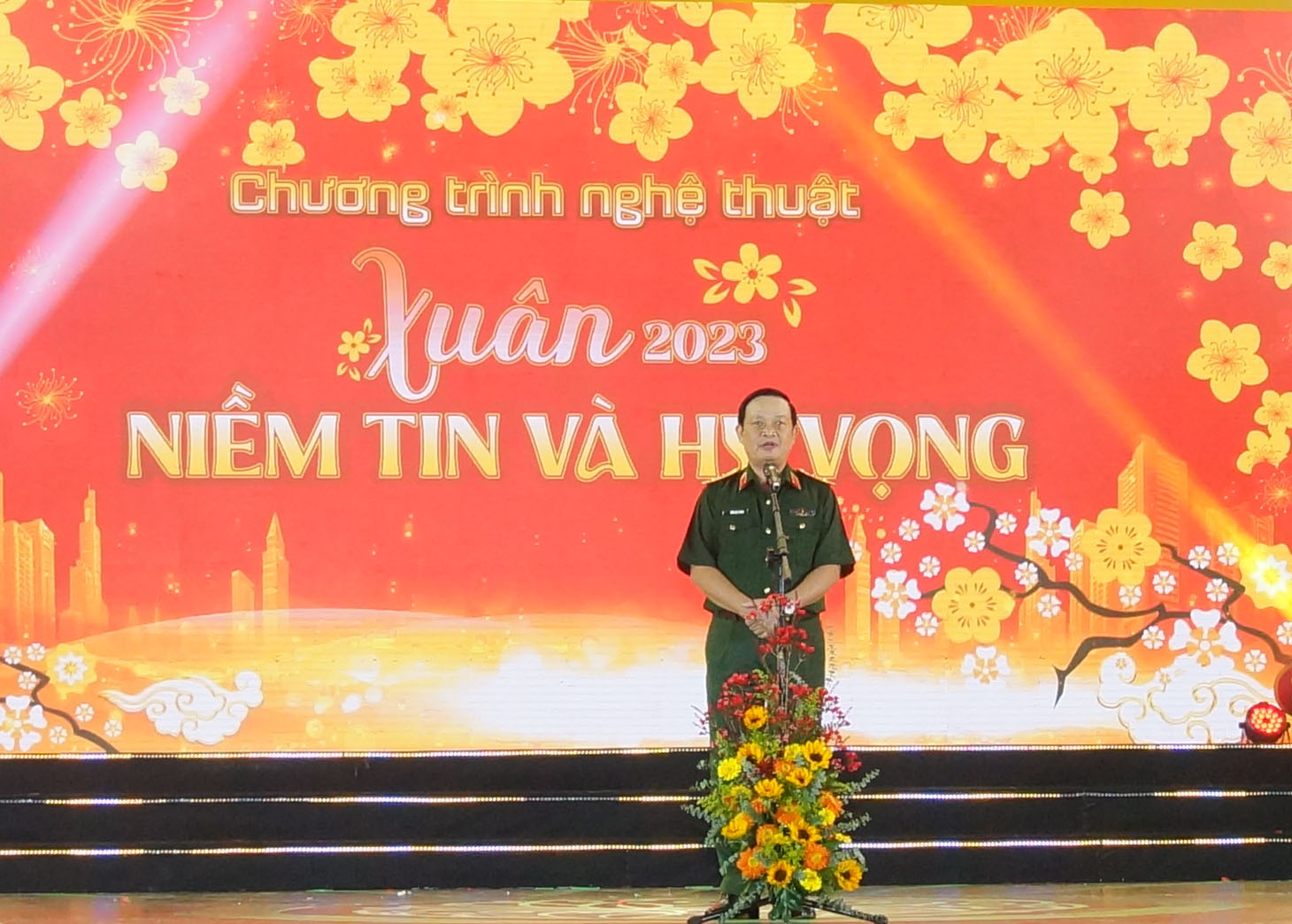 Trung tướng Trần Hoài Trung, Bí thư Đảng ủy, Chính ủy Quân khu phát biểu khai mạc Chương trình nghệ thuật "Xuân 2023 niềm tin và hy vọng".