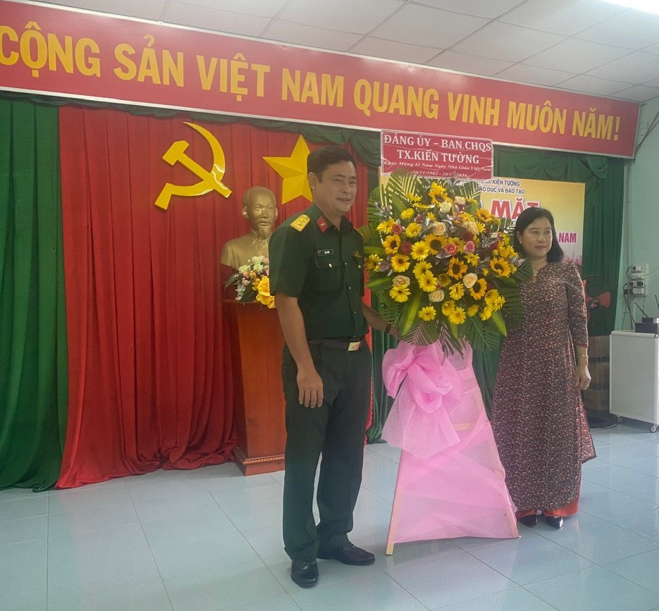 Trung tá Võ Lê Hiến, Chính trị viên Ban CHQS thị xã Kiến Tường tặng hoa, quà chúc mừng Phòng Giáo dục và Đào tạo thị xã.