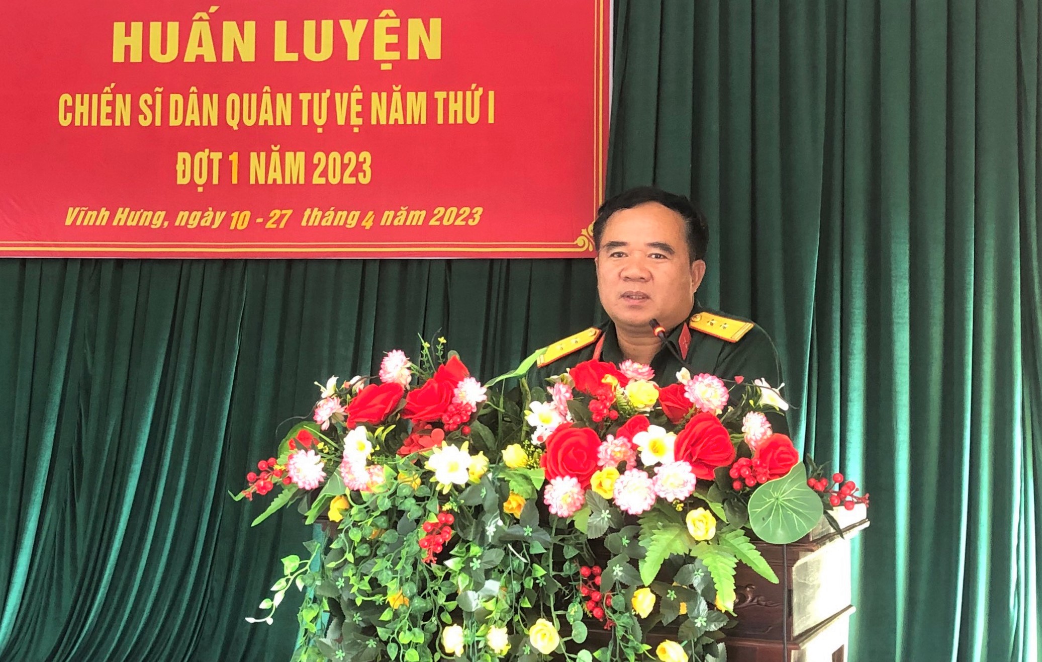 Trung tá Lê Văn Mến, Phó Chỉ huy trưởng Ban CHQS huyện Vĩnh Hưng phát biểu khai mạc.