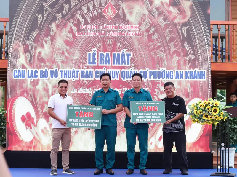 Tại buổi lễ, Công ty TNHH Tư vấn Xây dựng – Kiến trúc Kiến Anh đã trao tặng gói trang bị tập luyện võ thuật trị giá 30 triệu đồng; Công ty TM&DV FANSVIET tặng gói tổ chức lễ ra mắt CLB trị giá 20 triệu đồng, góp phần hỗ trợ, động viên hoạt động của CLB Võ thuật Ban CHQS phường An Khánh.