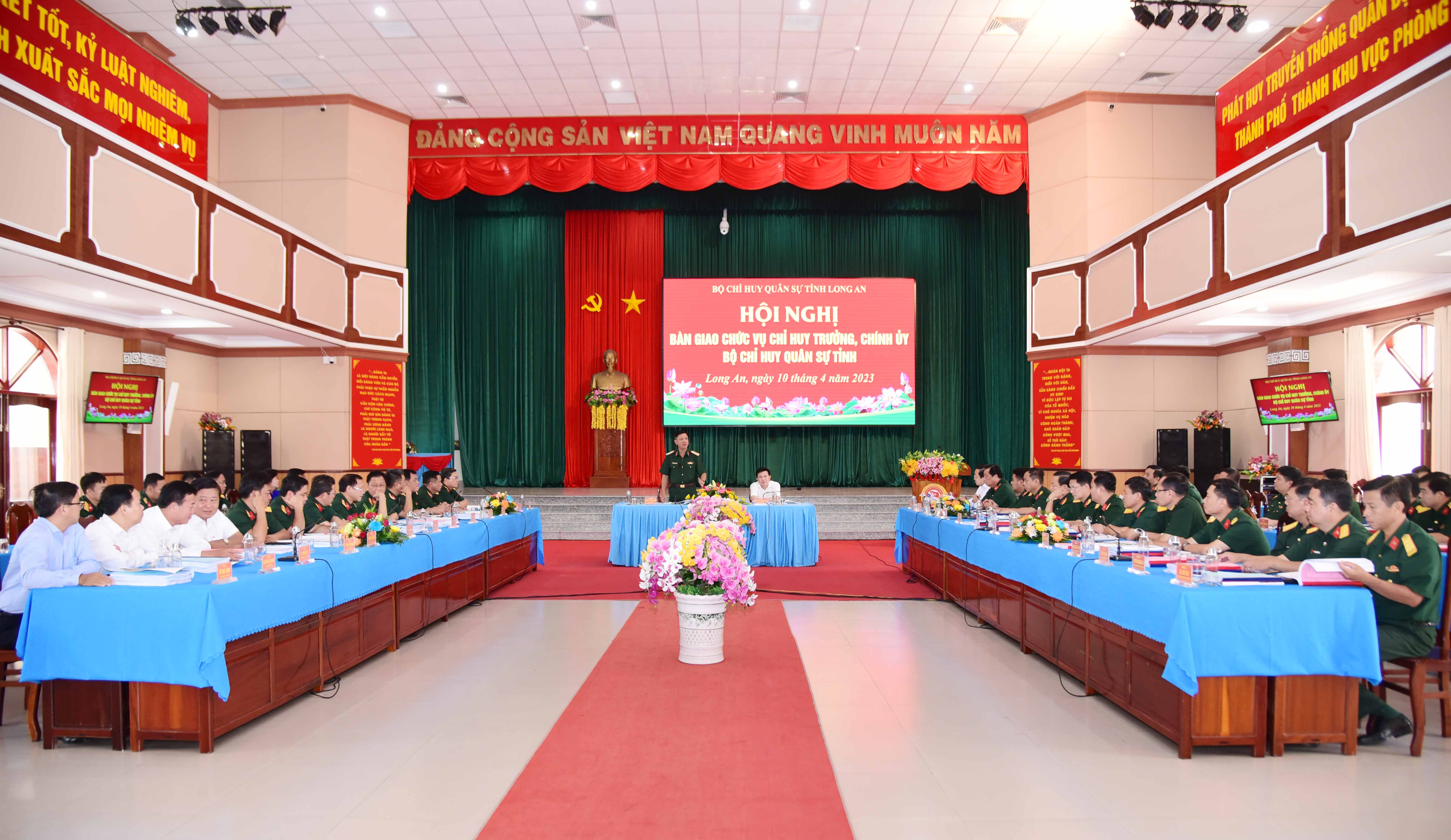 (QK7 Online) - Bộ chỉ huy quân sự tỉnh Long An tổ chức Hội nghị bàn giao chức vụ Chỉ huy trưởng, Chính ủy Bộ chỉ huy quân sự tỉnh. Trung tướng Nguyễn Trường Thắng, Ủy viên Trung ương Đảng, Ủy viên Quân ủy Trung ương, Tư lệnh Quân khu 7 và đồng chí Nguyễn Thanh Hải, Phó Bí thư thường trực Tỉnh ủy Long An chủ trì hội nghị.
