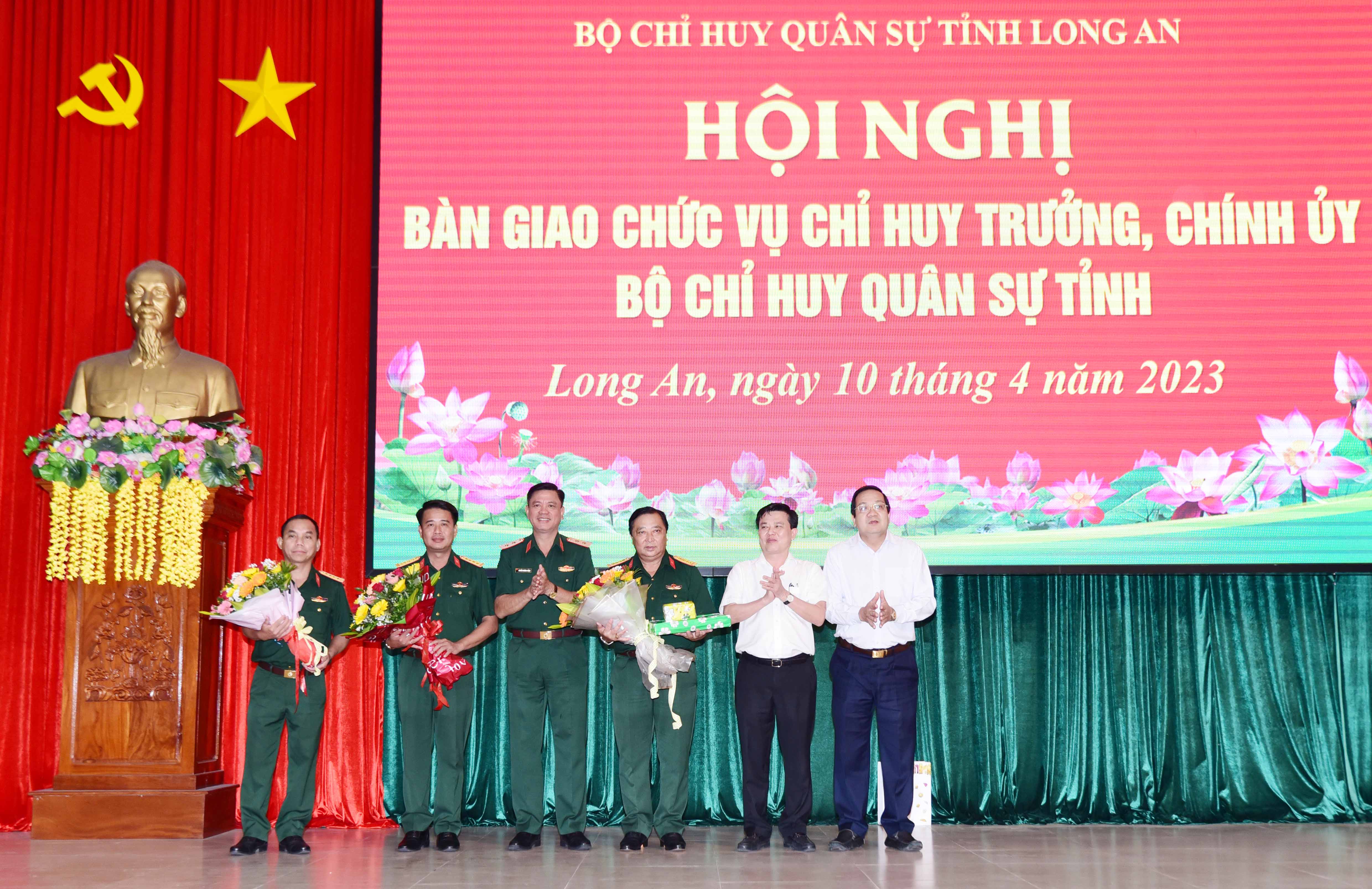Trung tướng Nguyễn Trường Thắng và lãnh đạo tỉnh Long An tặng hoa chúc mừng các đồng chí nhận nhiệm vụ mới