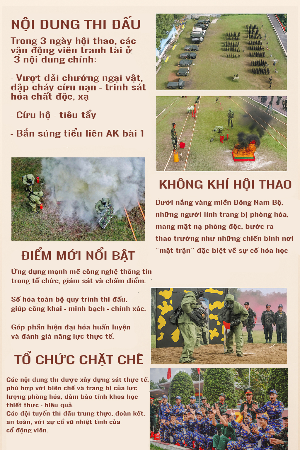 Để hội thao thành công, tốt đẹp,Thiếu tướng Nguyễn Đình Hiền, Tư lệnh Binh chủng Hóa học yêu cầu, mỗi cán bộ, chiến sĩ, vận động viên nêu cao tinh thần trách nhiệm, chấp hành nghiêm quy tắc an toàn, nắm chắc quy trình, kỹ thuật, vận hành chính xác trang bị, vũ khí, khí tài hóa học. Các lực lượng bảo đảm, y tế, thông tin, kỹ thuật, cứu hộ hiệp đồng chặt chẽ, bảo đảm an toàn tuyệt đối về người, vũ khí và môi trường. Ban Giám khảo, Tổ Trọng tài, Thư ký làm việc khách quan, công tâm, phản ánh trung thực, chính xác kết quả hội thao. Xác định an toàn là yếu tố hàng đầu, đồng thời phát huy tinh thần đoàn kết - kỷ luật - sáng tạo - quyết thắng, làm cho Hội thao thật sự là ngày hội của lực lượng phòng hóa toàn quân.