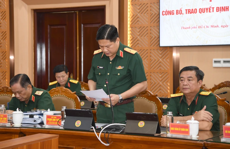 Thiếu tướng Phạm Anh Tuấn, Ủy viên Ban Thường vụ Đảng ủy, Chủ nhiệm Chính trị Quân khu công bố các quyết định.