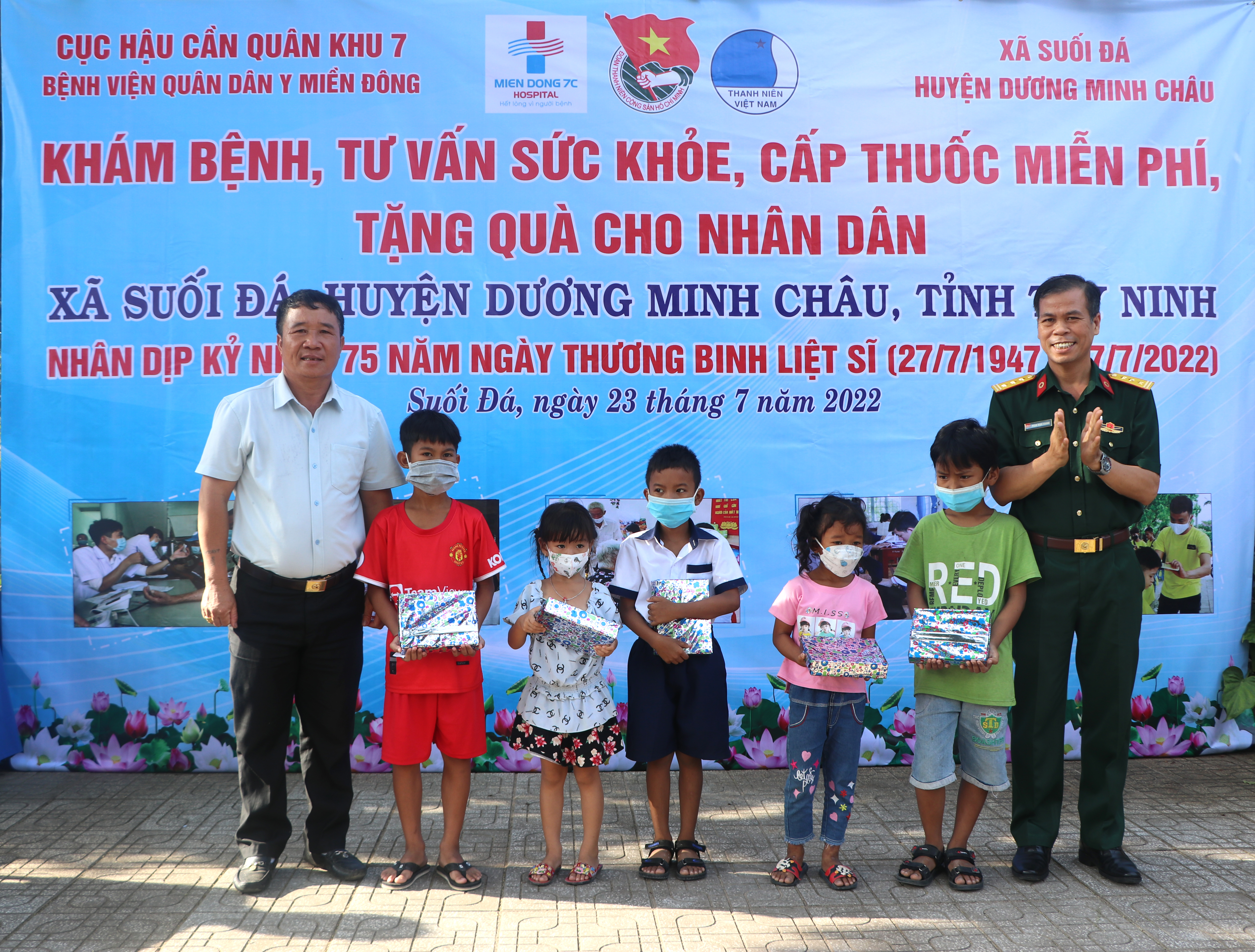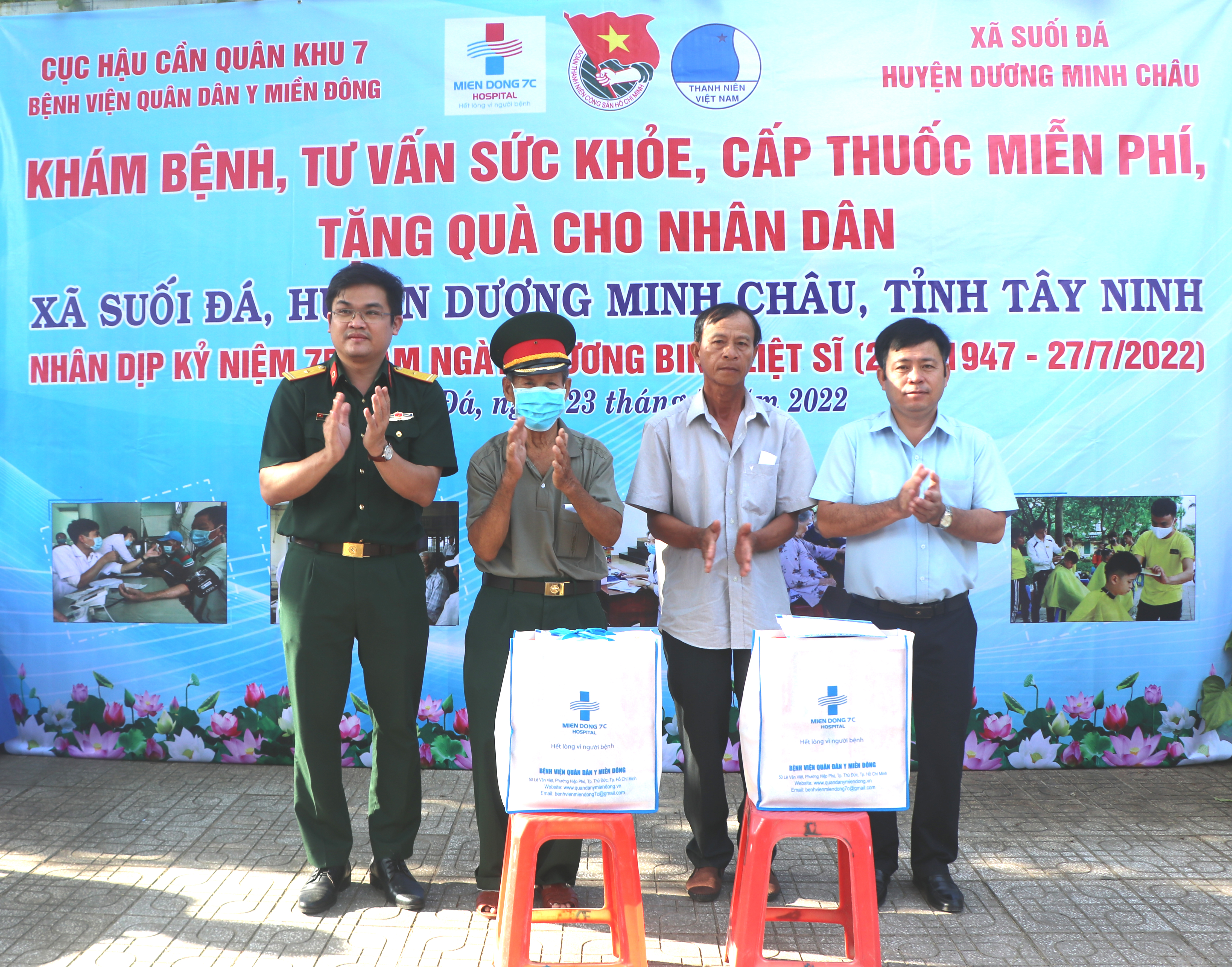 (QK7 Online) - Ngày 23-7, Bệnh viện Quân dân y miền Đông tổ chức khám bệnh, cấp thuốc, tặng quà gia đình chính sách, hộ nghèo và các hoạt động thiện nguyện giúp Nhân dân trên địa bàn xã Suối Đá, huyện Dương Minh Châu, tỉnh Tây Ninh.