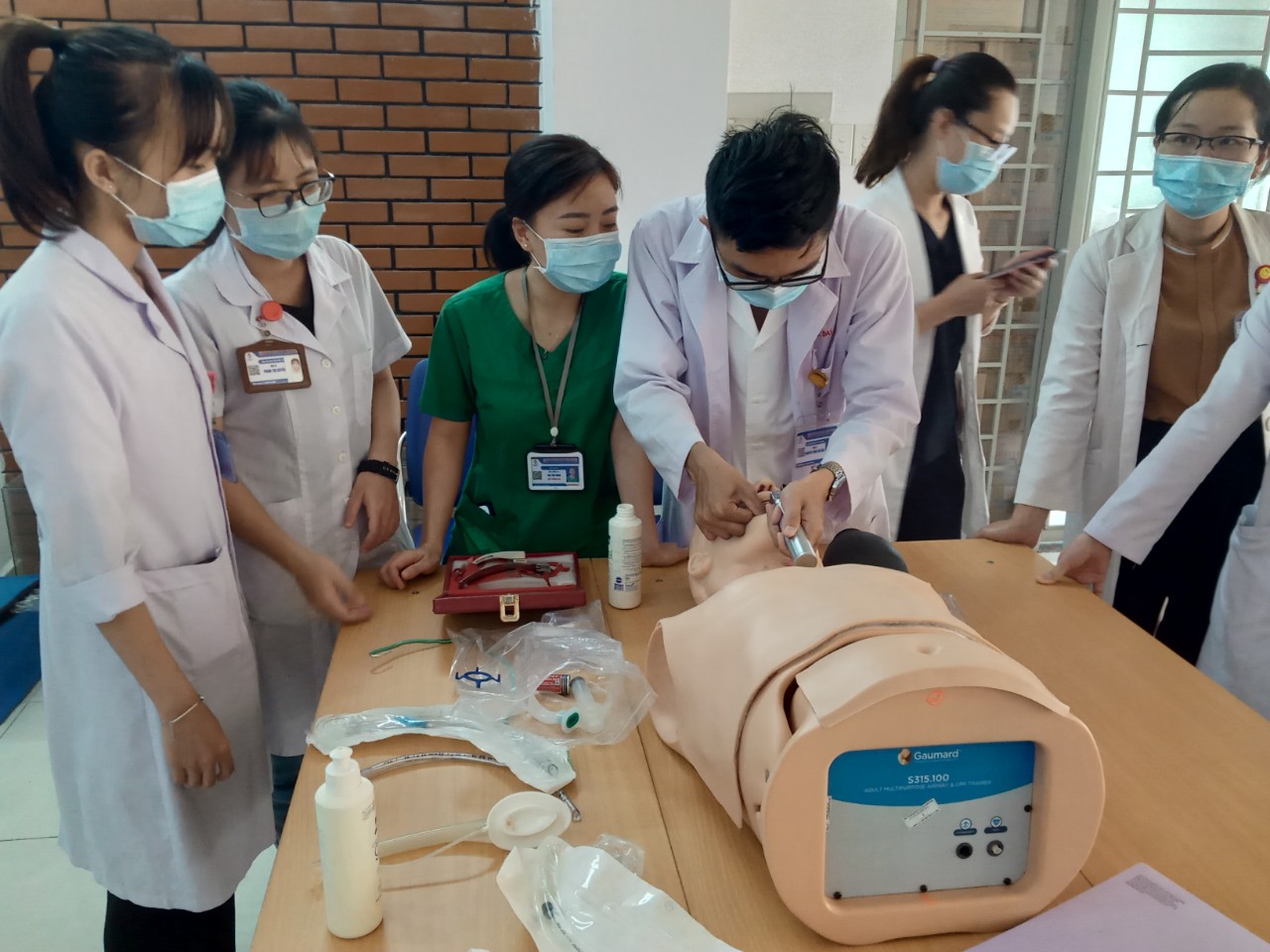 Các đội viên đội cấp cứu 115 của bệnh viện thực hành đặt nội khí quản trên mô hình.