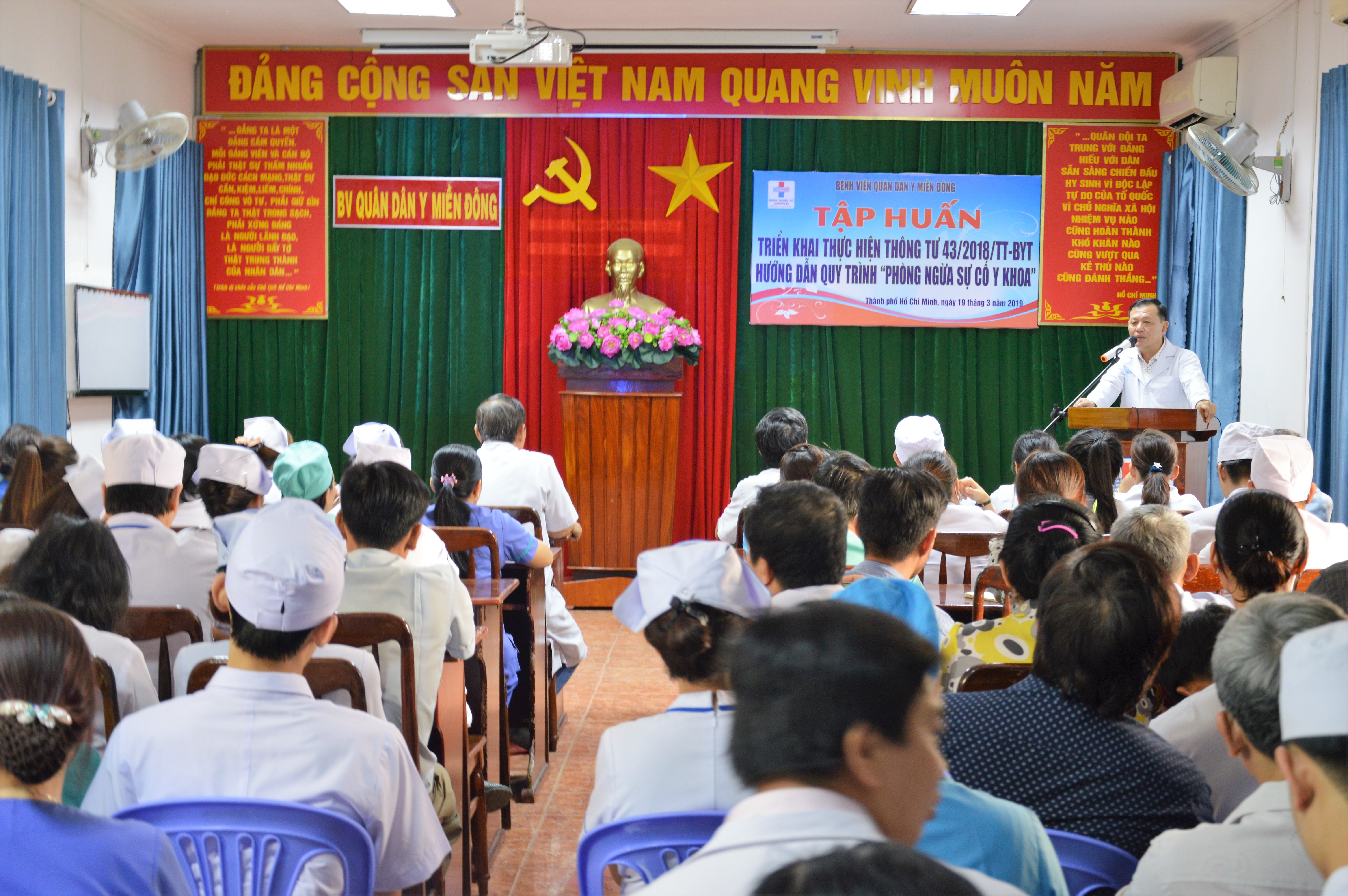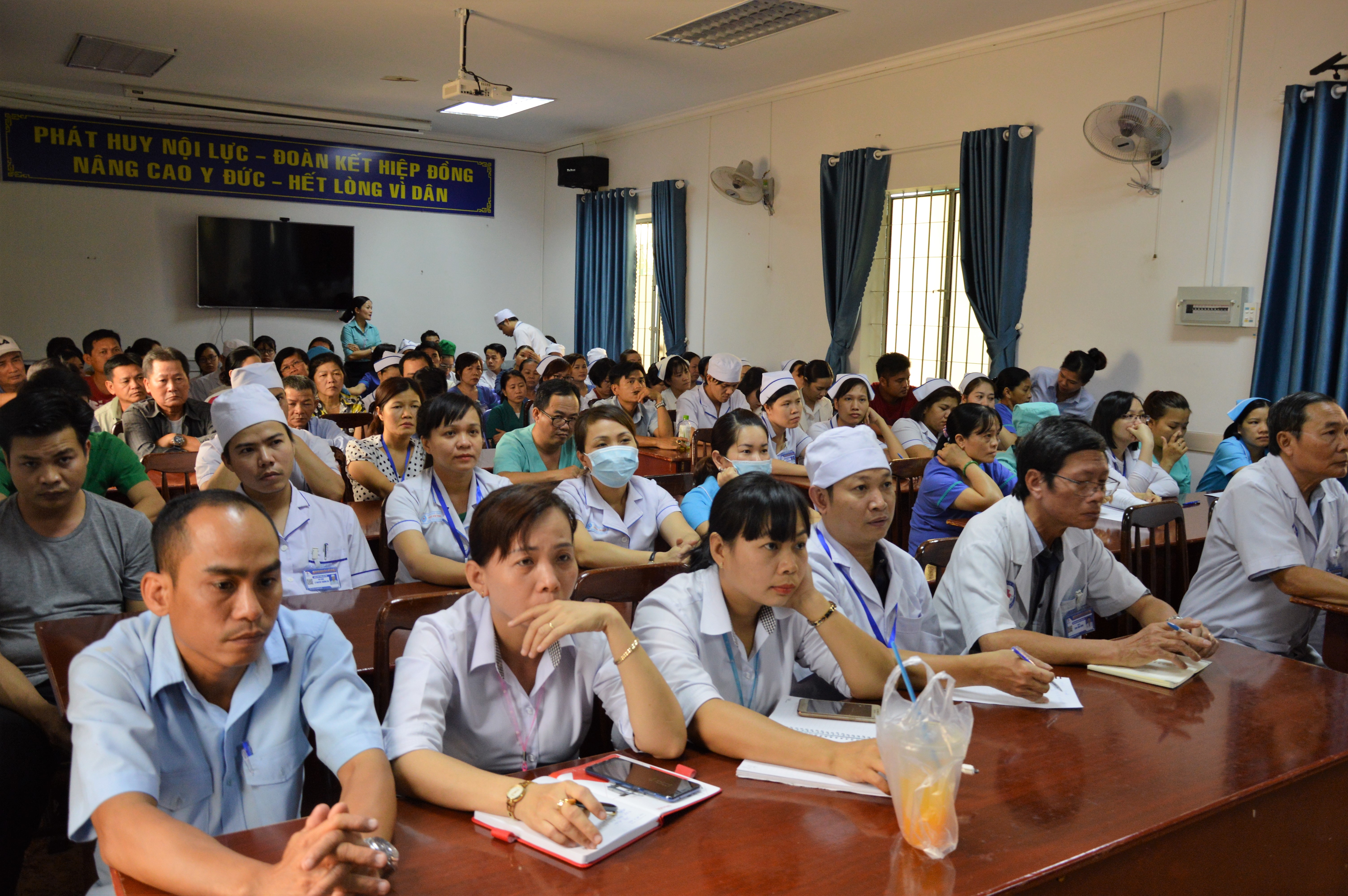 Ban Quản lý chất lượng Bệnh viện tổ chức 4 lớp tập huấn, mỗi lớp 45 phút; gồm 1 lớp dành cho đối tượng cán bộ chủ chốt các khoa, ban và 3 lớp dành cho tất cả cán bộ nhân viên còn lại. BS CKI Phùng Xuân Hải - Trưởng ban Quản lý chất lượng trình bày các nội dung nhận diện, báo cáo, phân tích, phản hồi, xử lý, khuyến cáo, cảnh báo khắc phục để phòng ngừa sự cố y khoa và trách nhiệm thực hiện của từng cá nhân. Bên cạnh đó, tất cả cán bộ nhân viên còn được nghe phổ biến các quy định của bệnh viện nhằm khuyến khích, khen thưởng cá nhân, tập thể tích cực tham gia báo cáo sự cố y khoa và các biện pháp chế tài, kỷ luật khi không báo cáo những sự cố gây tổn thương nặng và nghiêm trọng.
