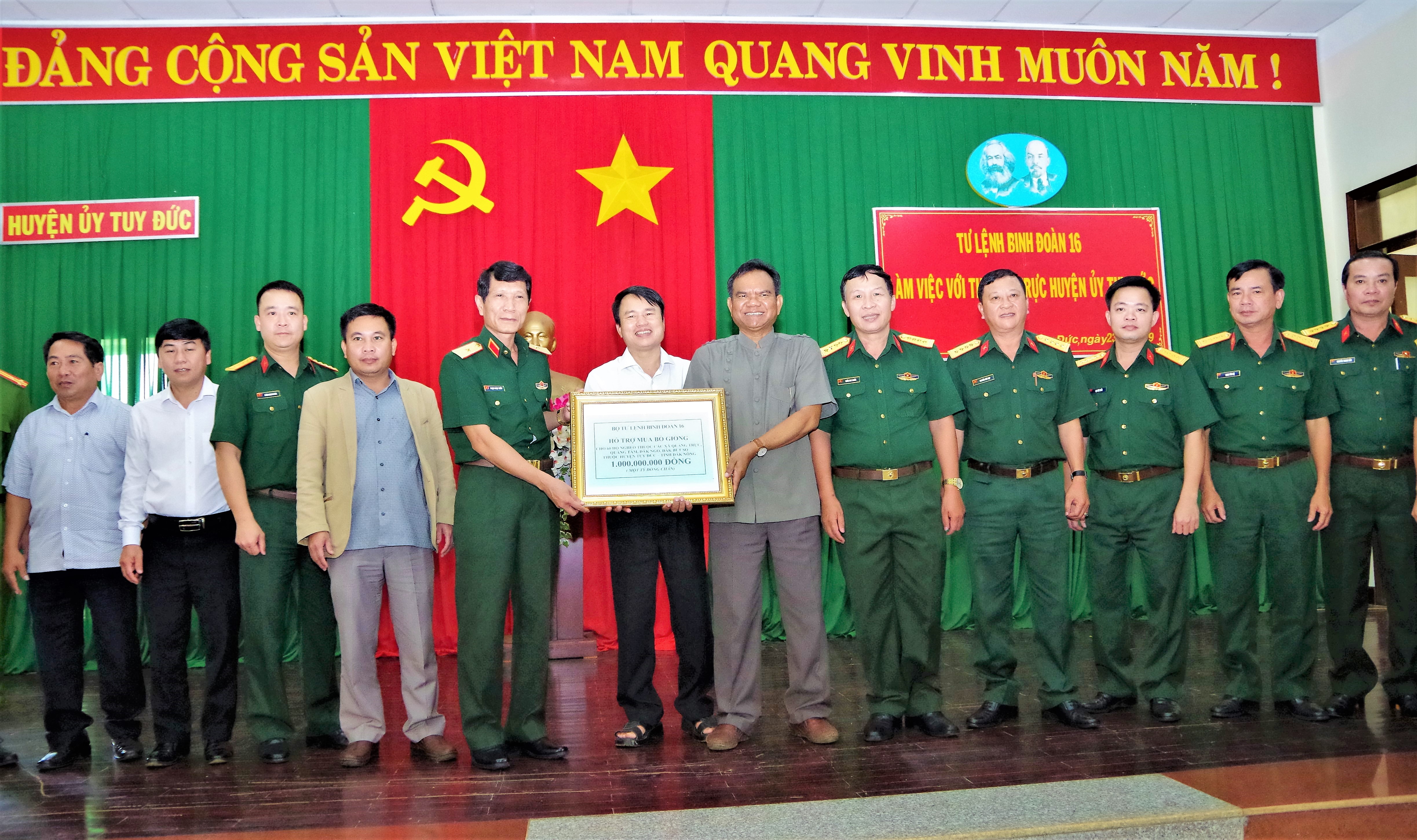 Thiếu tướng Phạm Ngọc Tuấn, Phó Bí thư Đảng ủy – Tư lệnh Binh đoàn 16 trao số tiền 1 tỷ đồng cho đại diện Huyện ủy huyện Tuy Đức tỉnh Đắc Nông.