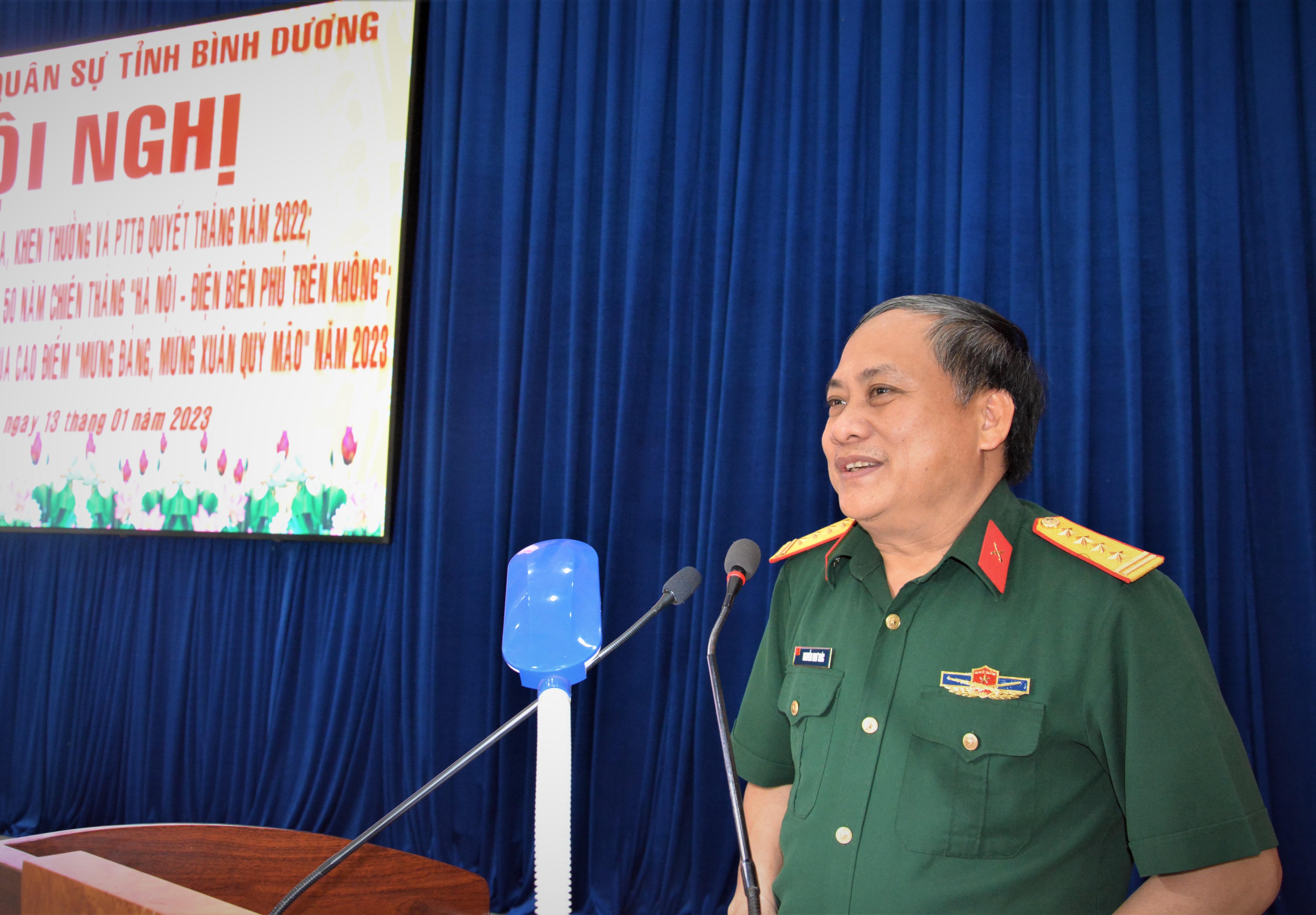 Tại hội nghị, Đại tá Nguyễn Đình Chuẩn, Chính ủy Bộ CHQS tỉnh Bình Dương, phát động thi đua cao điểm với chủ đề “Mừng Đảng, mừng xuân, ra quân quyết thắng”. Theo đó, đợt thi đua tập trung vào nâng cao chất lượng nghiên cứu, dự báo, tham mưu đúng, trúng, kịp thời, hiệu quả; giúp chỉ huy các cấp triển khai nhiệm vụ năm 2023 và giúp đơn vị hoàn thành xuất sắc nhiệm vụ được giao, quyết tâm xây dựng tổ chức Đảng TSVM, đơn vị vững mạnh toàn diện “mẫu mực, tiêu biểu” với kết quả cao hơn năm 2022.