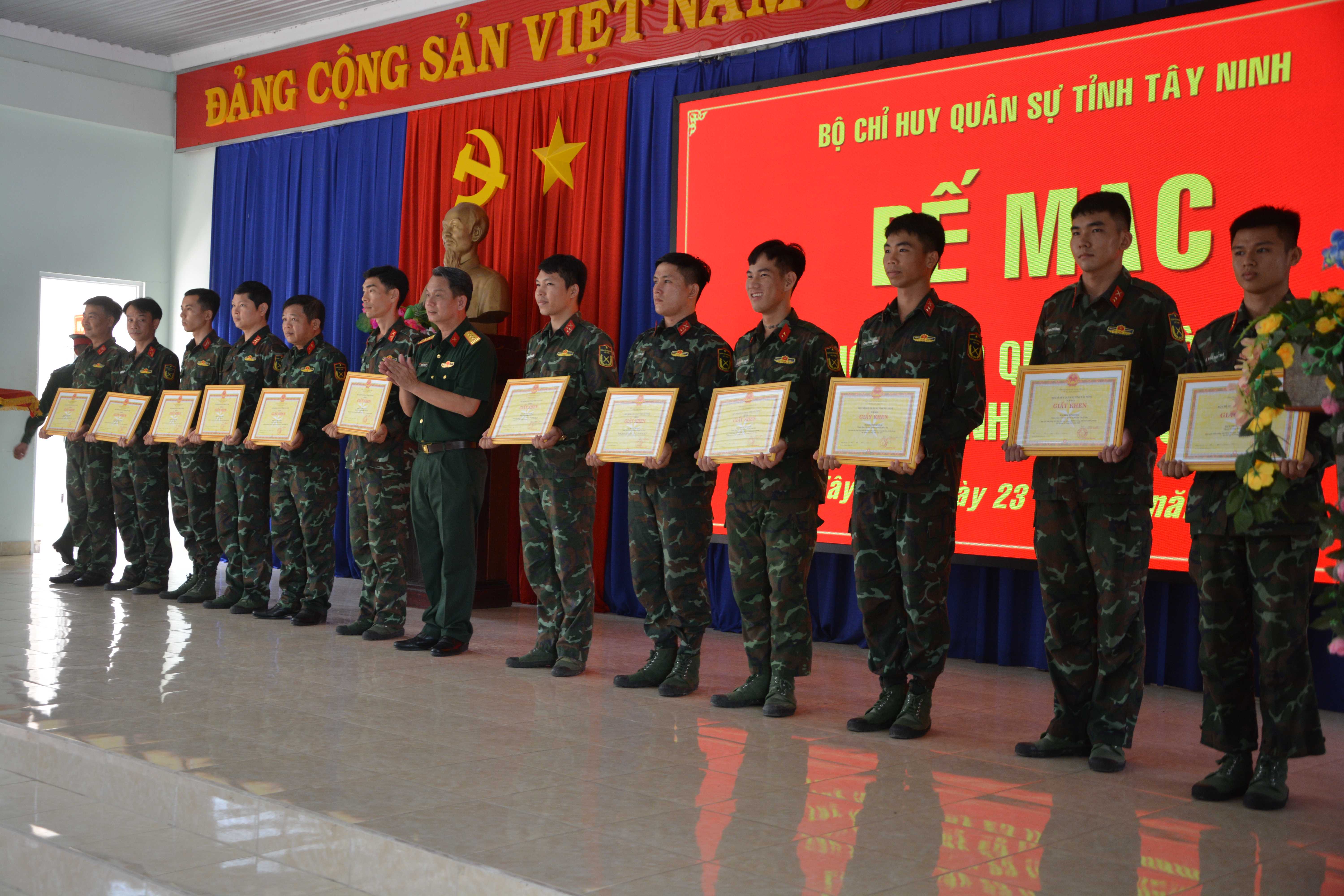 Thượng tá Nguyễn Thành Tâm, Phó Chỉ huy trưởng, Tham mưu Bộ CHQS tỉnh trao thưởng các tập thể đạt thành tích xuất sắc trong hội thao.