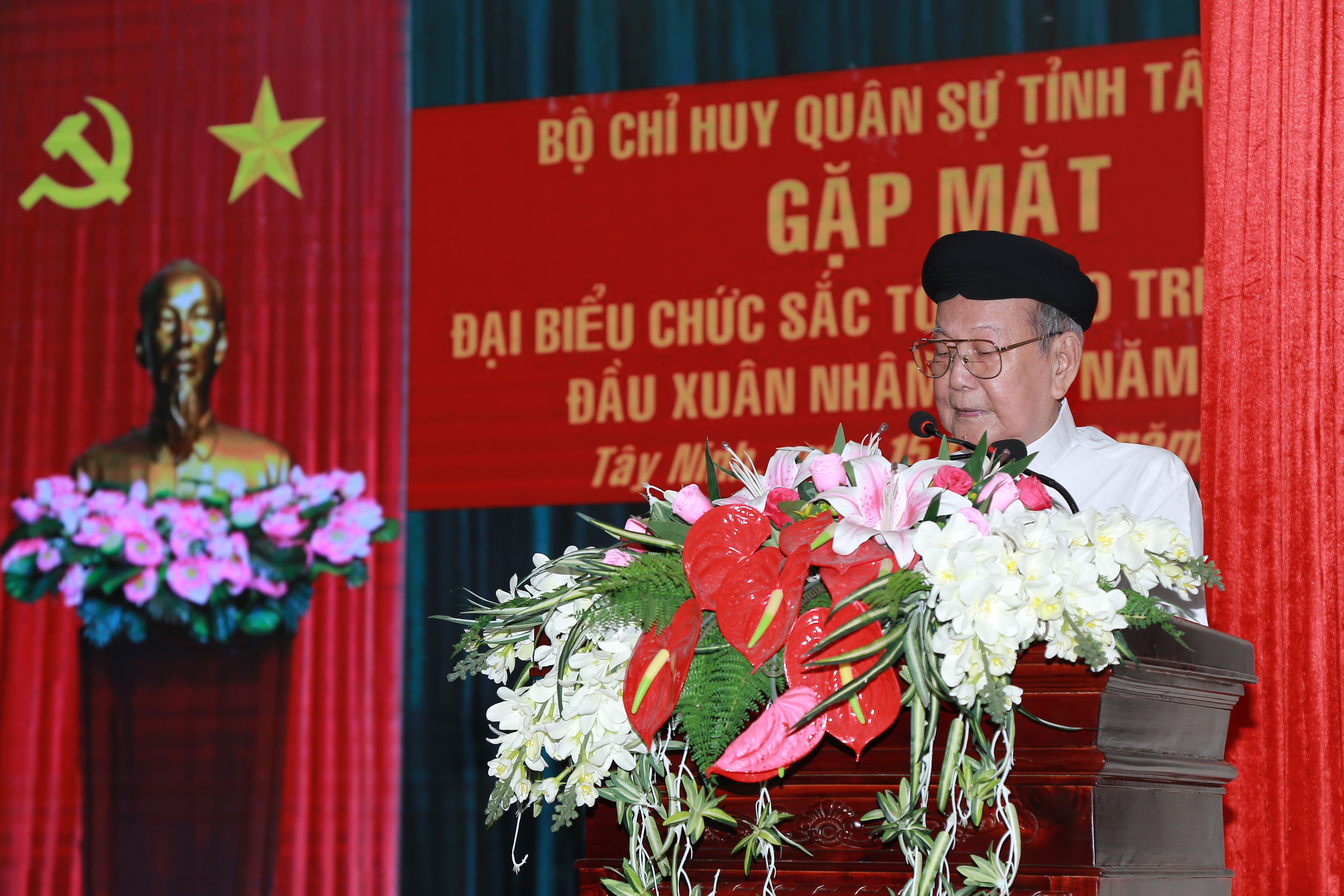 Đại tá Hoàng Xuân Cường, Chính ủy Bộ CHQS tỉnh Tây Ninh tặng hoa và quà chúc mừng các chức sắc, chức việc, nhà tu hành trên địa bàn tỉnh.