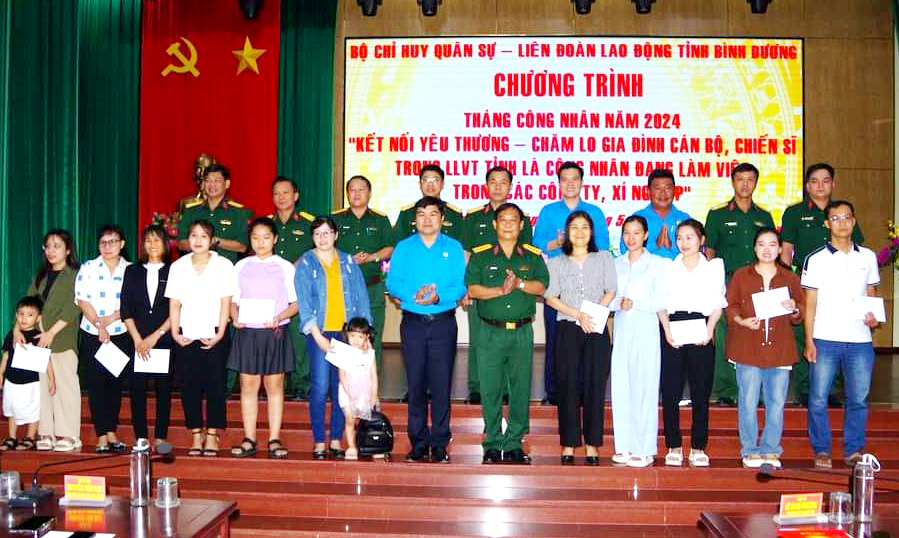 Dịp này, Liên đoàn lao động tỉnh tặng 18 phần quà, mỗi phần trị giá 1 triệu đồng cho thân nhân cán bộ, chiến sĩ LLVT tỉnh Bình Dương.