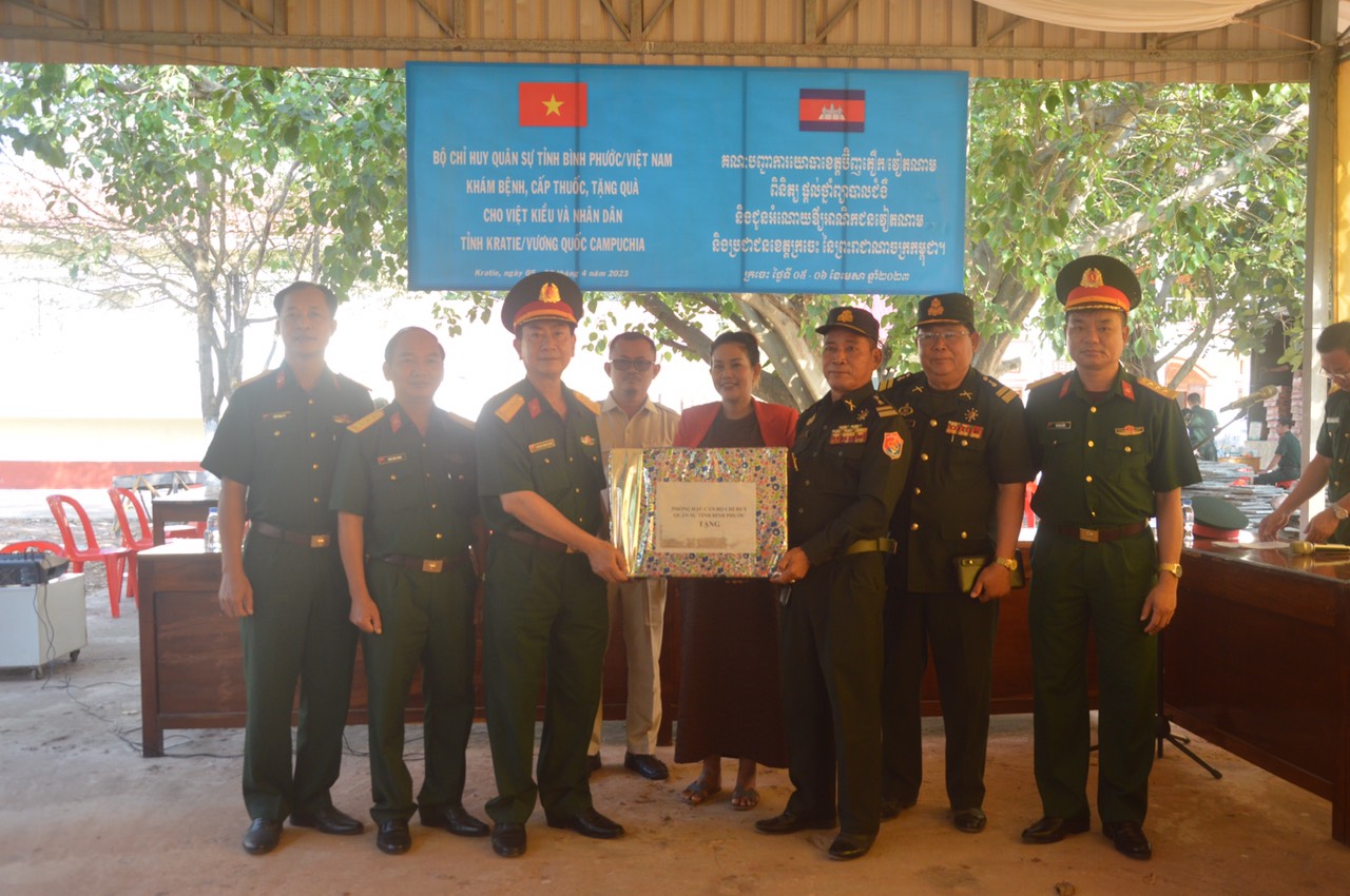 Dịp này, nhân tết cổ truyền Chôl Chnăm Thmây của đất nước Campuchia, Bộ CHQS tỉnh Bình Phước tặng 400 suất quà cho hộ nghèo của 2 huyện, gồm các nhu yếu phẩm, với tổng trị giá 200 triệu đồng và 70 triệu đồng tiền thuốc cấp cho người dân.