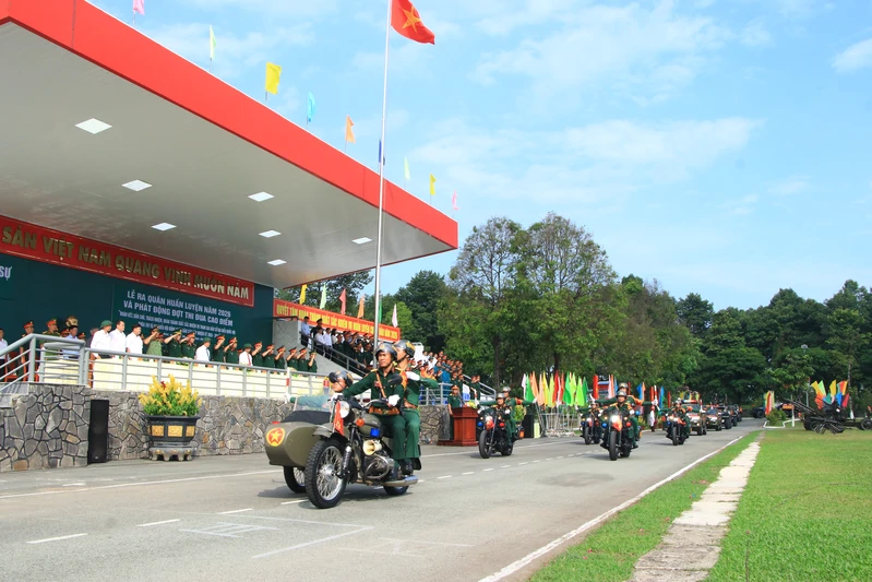Khối xe mô tô tiến qua lễ đài tại lễ ra quân huấn luyện Bộ CHQS tỉnh Đồng Nai năm 2026.