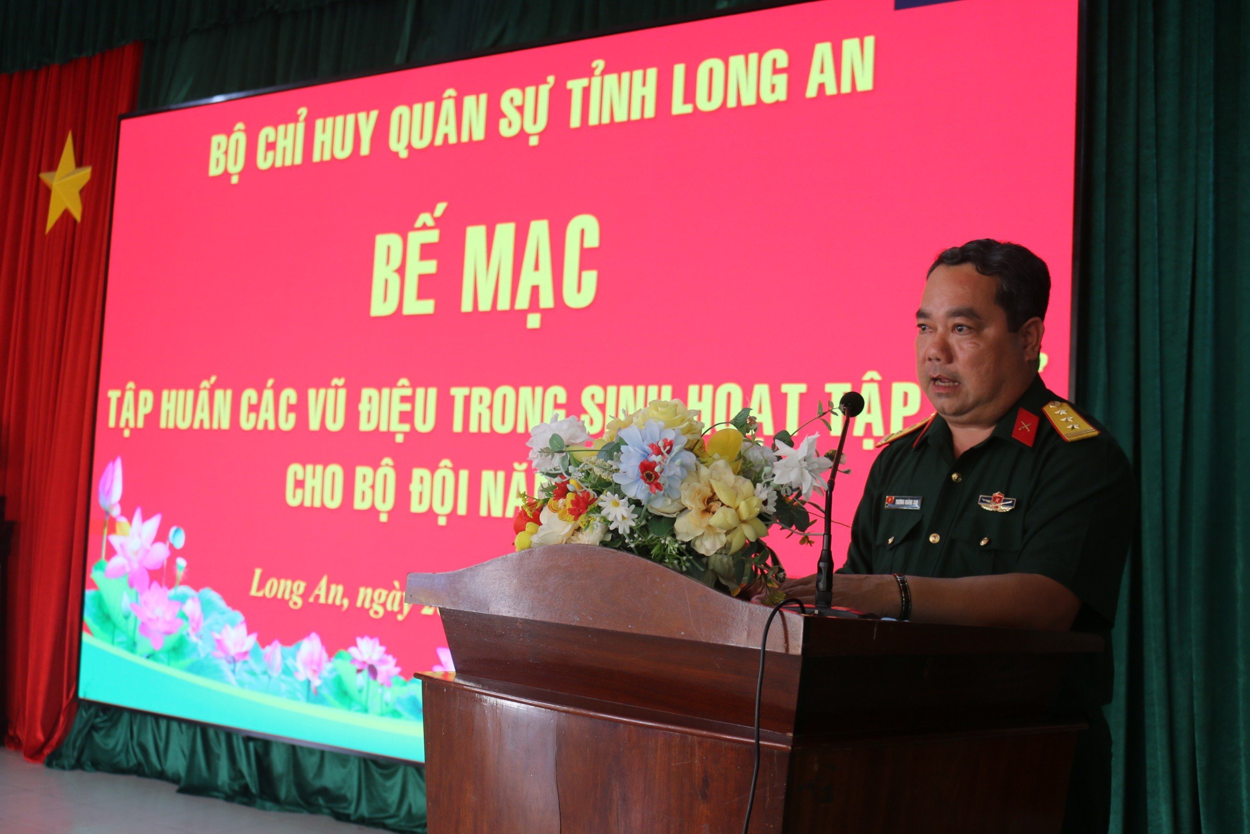 (QK7 Online) - Ngày 28/6, Bộ Chỉ huy Quân sự (CHQS) tỉnh Long An tổ chức bế mạc lớp tập huấn các vũ điệu trong sinh hoạt tập thể cho bộ đội năm 2024. Thượng tá Trương Hoàng San, Phó Chủ nhiệm Chính trị Bộ CHQS tỉnh dự phát biểu bế mạc.