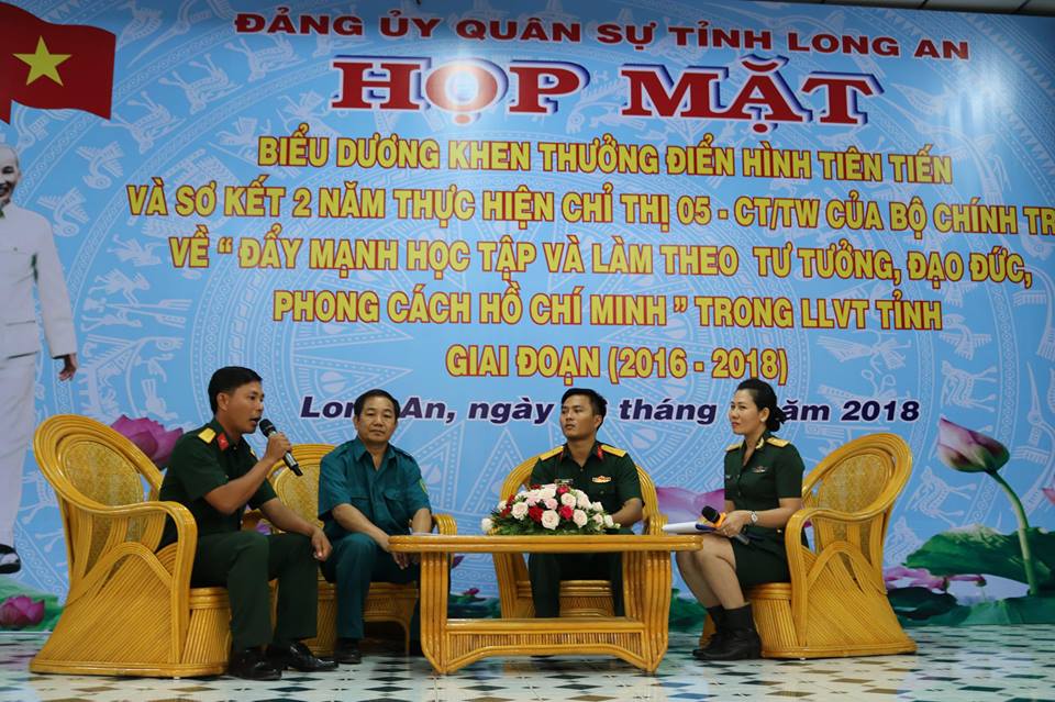 (QK7 Online)- Nhân dịp kỉ niệm 128 năm ngày sinh của Chủ tịch Hồ Chí Minh, ngày 16 tháng 5 năm 2018, Bộ CHQS tỉnh Long An đã tổ chức buổi họp mặt biểu dương khen thưởng điển hình tiên tiến và Sơ kết 2 năm thực hiện chỉ thị 05- CT/TW của Bộ Chính trị về “Đẩy mạnh học tập và làm theo tư tưởng, đạo đức, phong cách Hồ Chí Minh” trong LLVT tỉnh giai đoạn (2016-2018). Đến dự có Đại tá Nguyễn Tuấn Bảo, Chính uỷ Bộ CHQS tỉnh Long An.