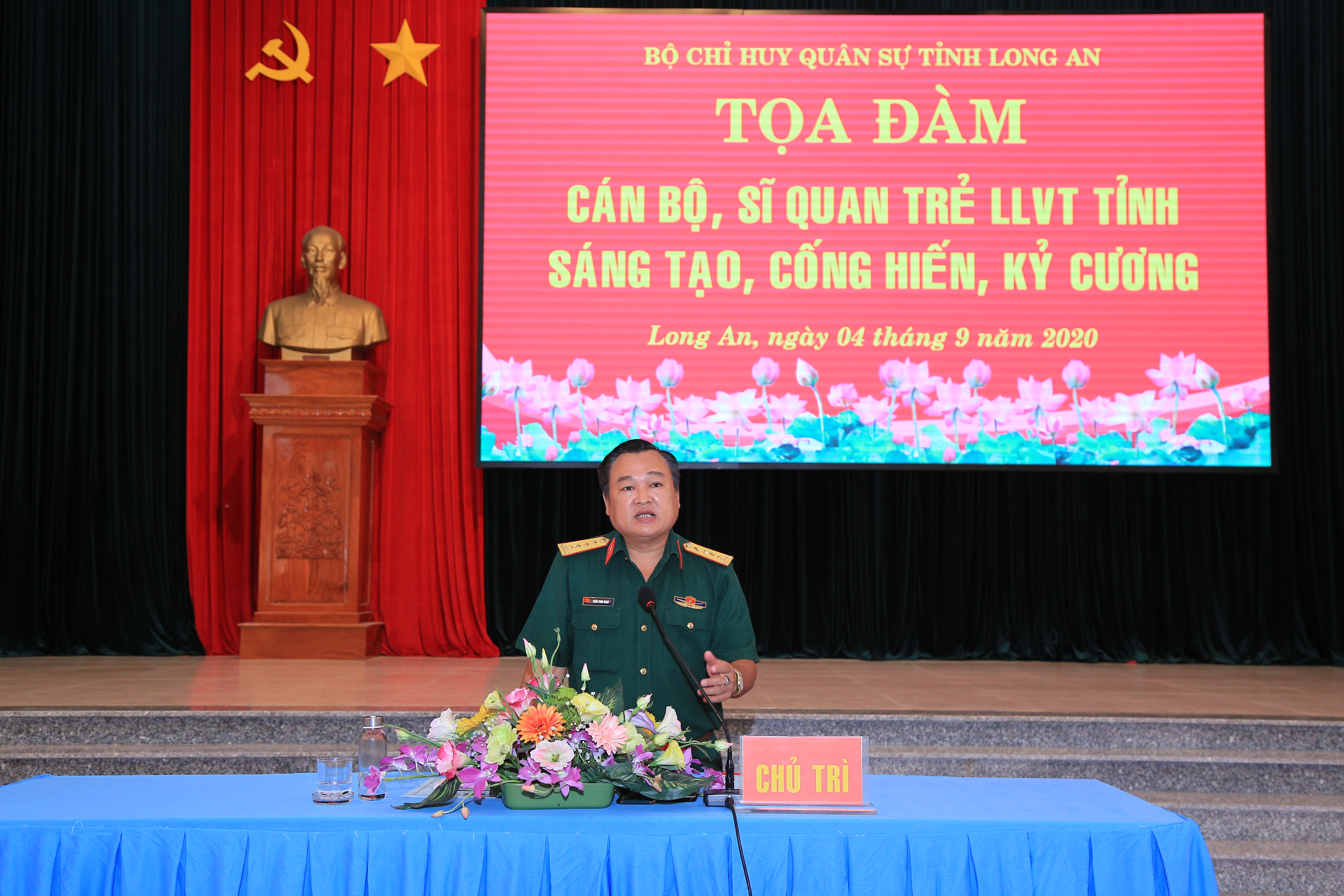 Đại tá Trần Vinh Ngọc, Chính ủy Bộ CHQS tỉnh Long An chủ trì buổi tọa đàm.