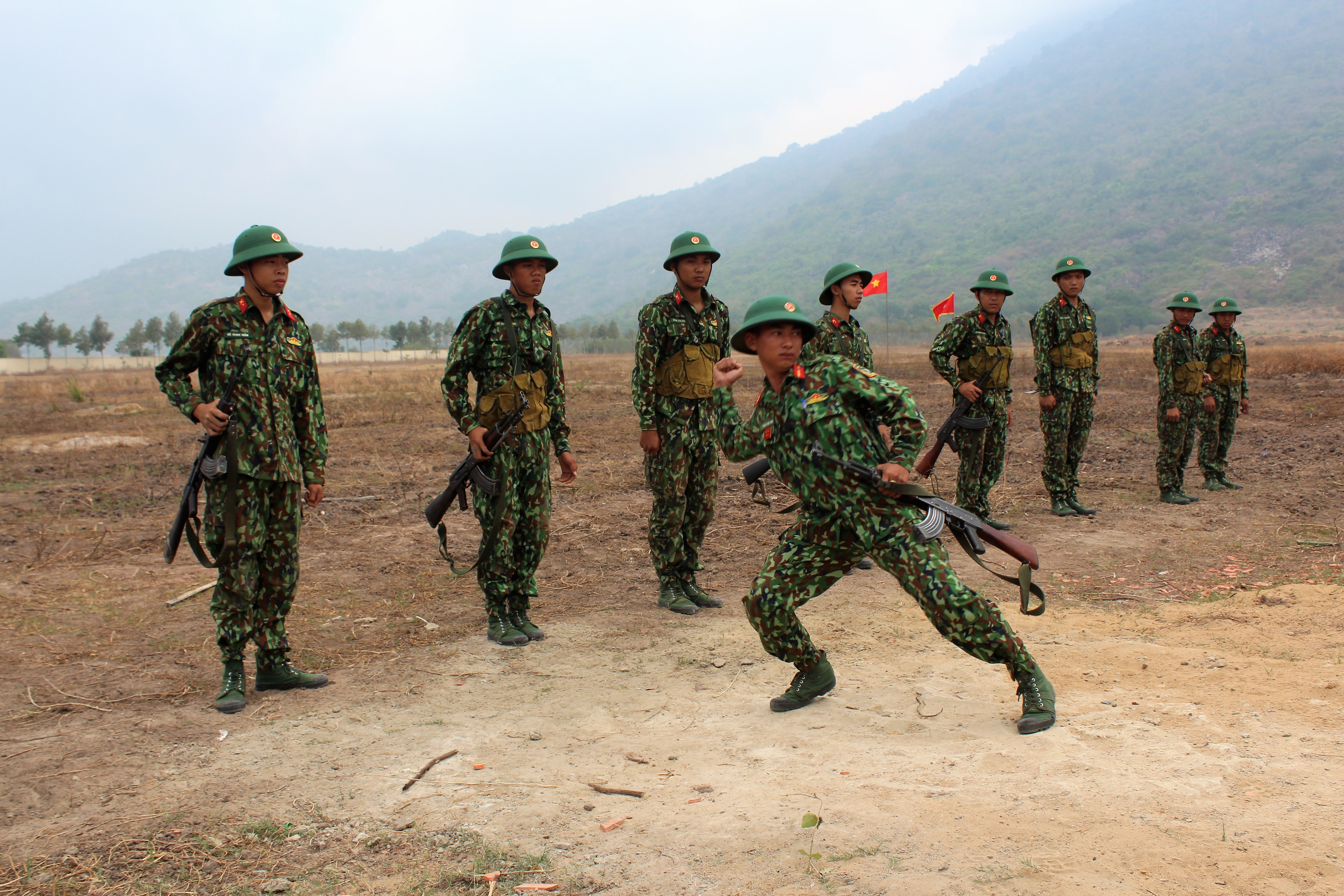 Chiến sĩ mới thực hành động tác ném lựu đạn xa trúng đích.