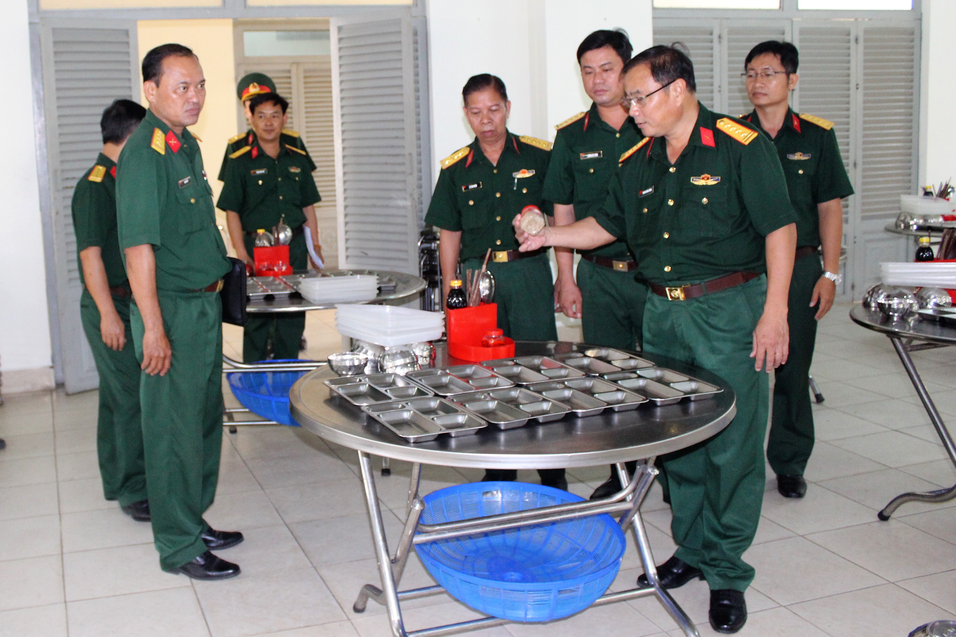 Đại tá Hoàng Xuân Cường kiểm tra chất lượng bữa ăn.