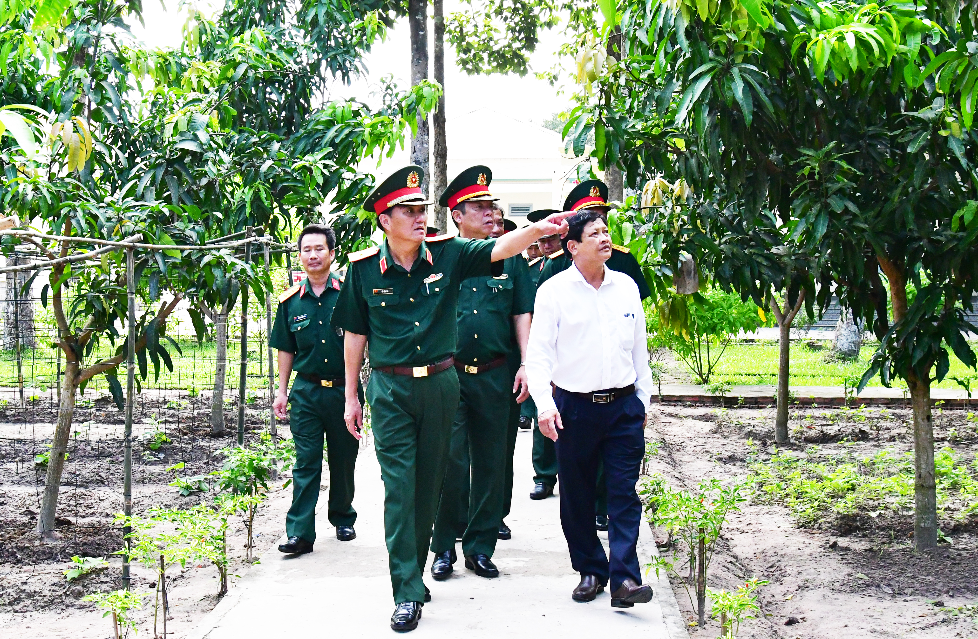 Thiếu tướng Võ Văn Thi, Phó Tư lệnh Quân khu 7 và đoàn công tác kiểm tra khu tăng gia sản xuất tập trung của Đại đội 40, Ban CHQS huyện Châu Thành.