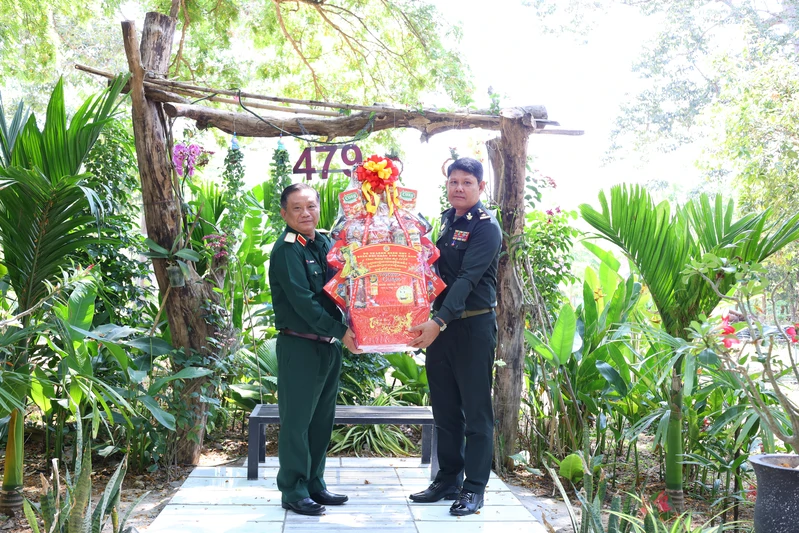 Thiếu tướng Trần Chí Tâm, Phó Chính ủy Quân khu 7 tặng quà Tết Thiếu tướng Nith Narong, Phó Tham mưu trưởng Quân khu 4, Quân đội Hoàng gia Campuchia, phụ trách Nhà lưu niệm Mặt trận 479.