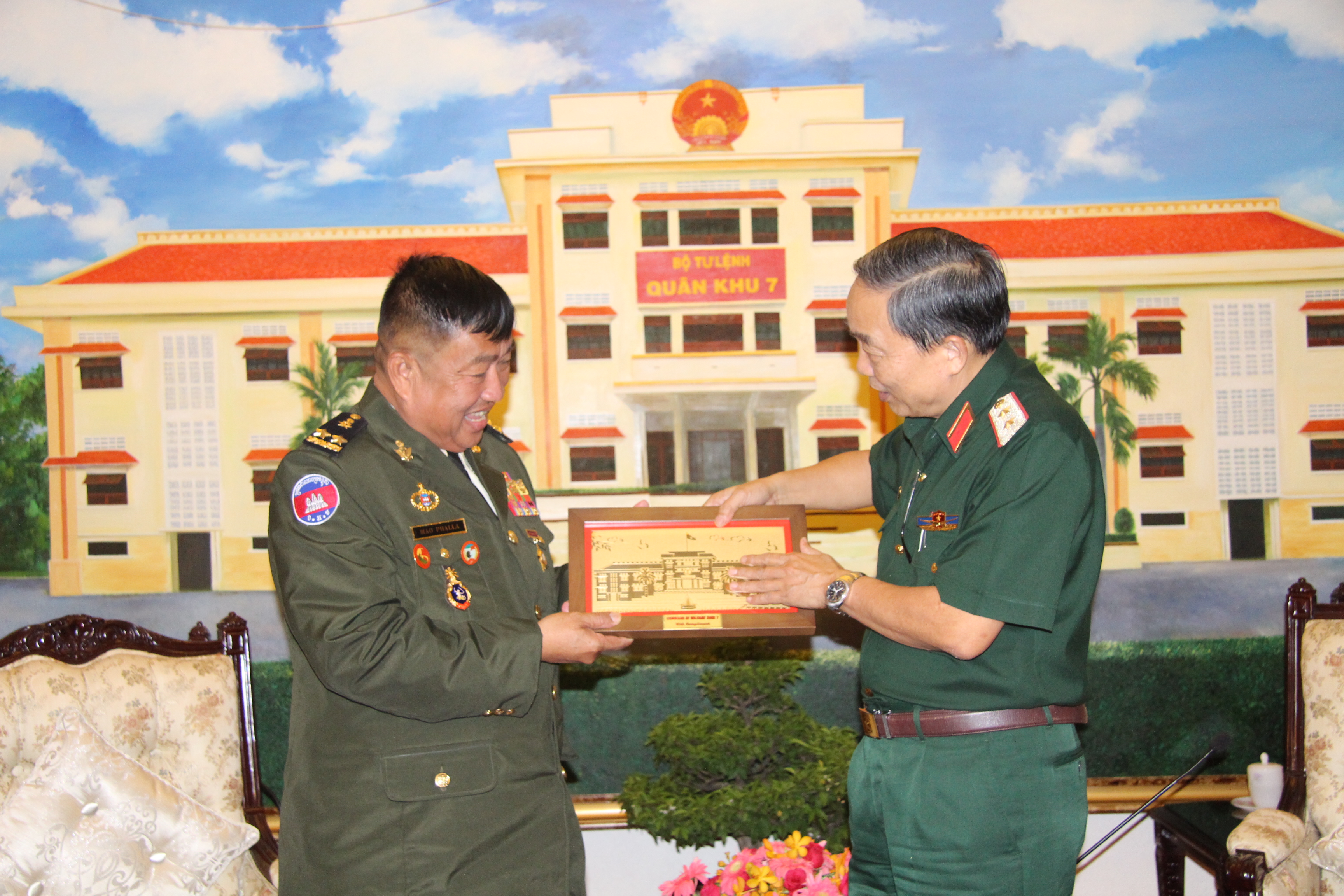 Trung tướng Phạm Văn Dỹ, Chính ủy Quân khu tặng biểu trưng cho Trung tướng Mao Phalla.