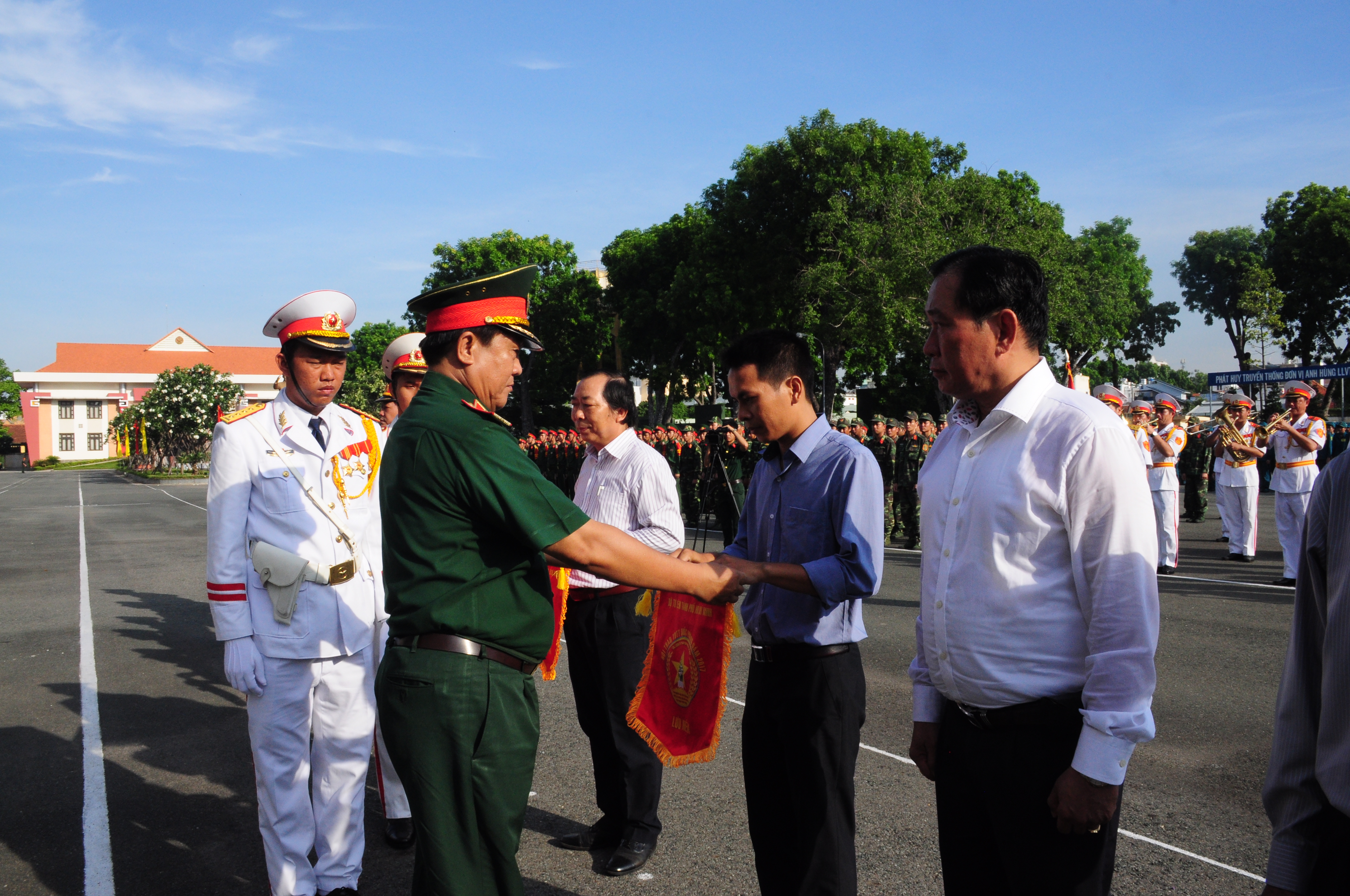 Thiếu tướng Trương Văn Hai, Tư lệnh Bộ Tư lệnh Thành phố Hồ Chí Minh tặng cờ lưu niệm cho các đoàn về tham gia hội thao