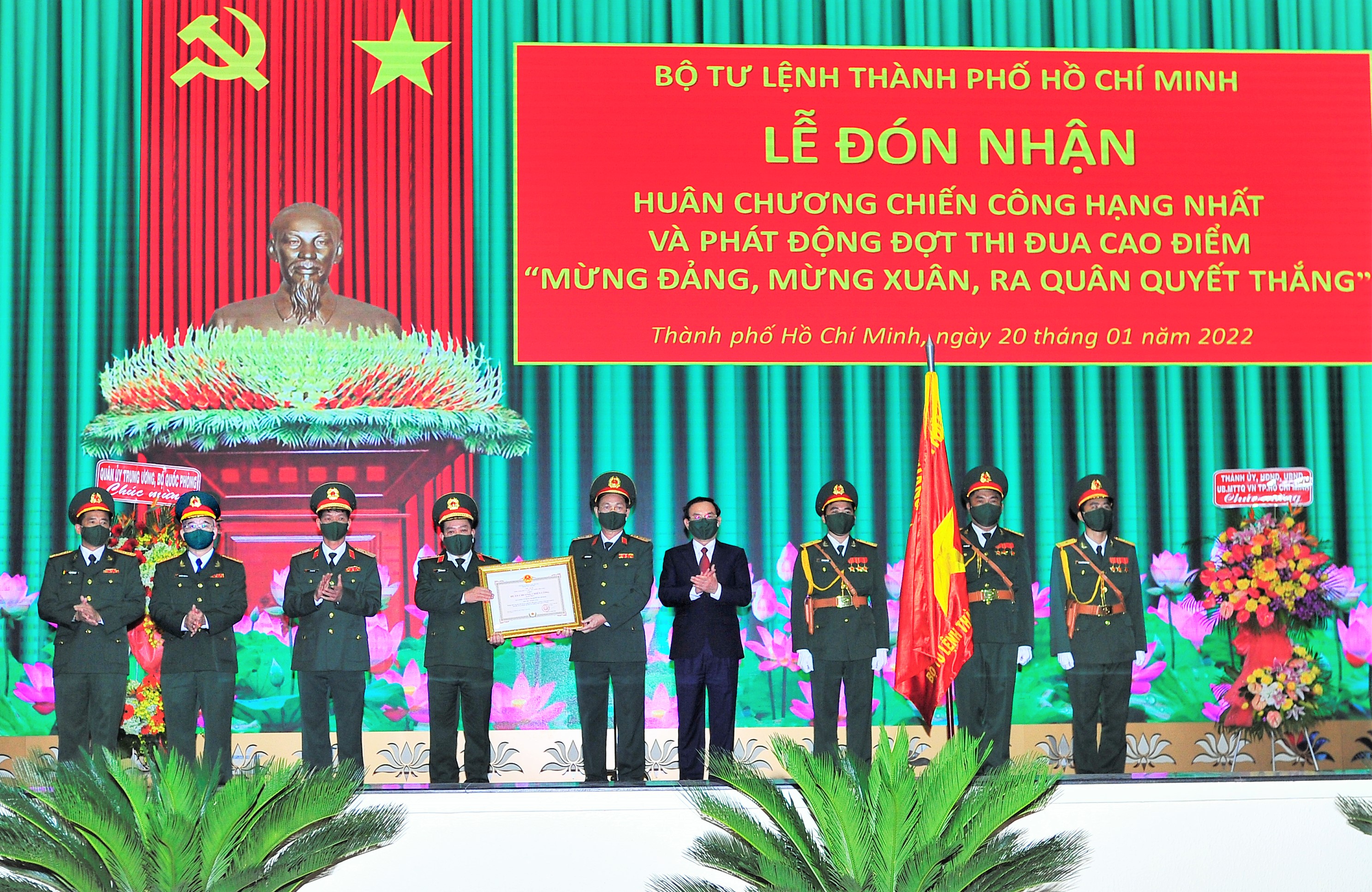 Đồng chí Nguyễn Văn Nên, Ủy viên Bộ Chính trị, Bí thư Thành ủy TP.HCM trao Huân chương Chiến công hạng Nhất cho Bộ Tư lệnh TP.HCM.