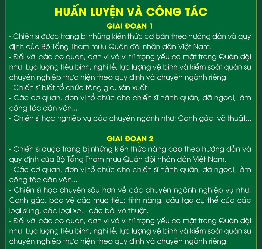 (QK7 Online) - Huấn luyện chiến sĩ mới là bước khởi đầu, là nền tảng hình thành phẩm chất, bản lĩnh quân nhân cách mạng. Chính vì thế, để chiến sĩ mới hiểu thêm về quá trình học tập, huấn luyện và trưởng thành trong môi trường quân ngũ. Dưới đây là tóm tắt các giai đoạn huấn luyện và thực hiện nhiệm vụ của chiến sĩ mới: