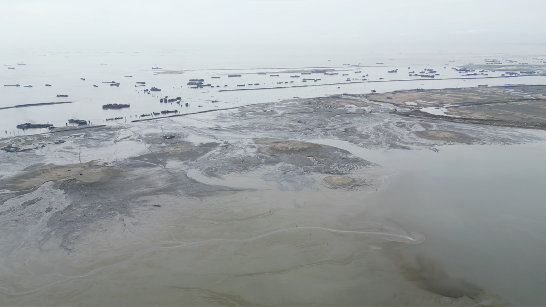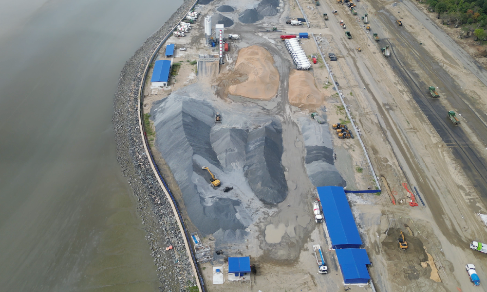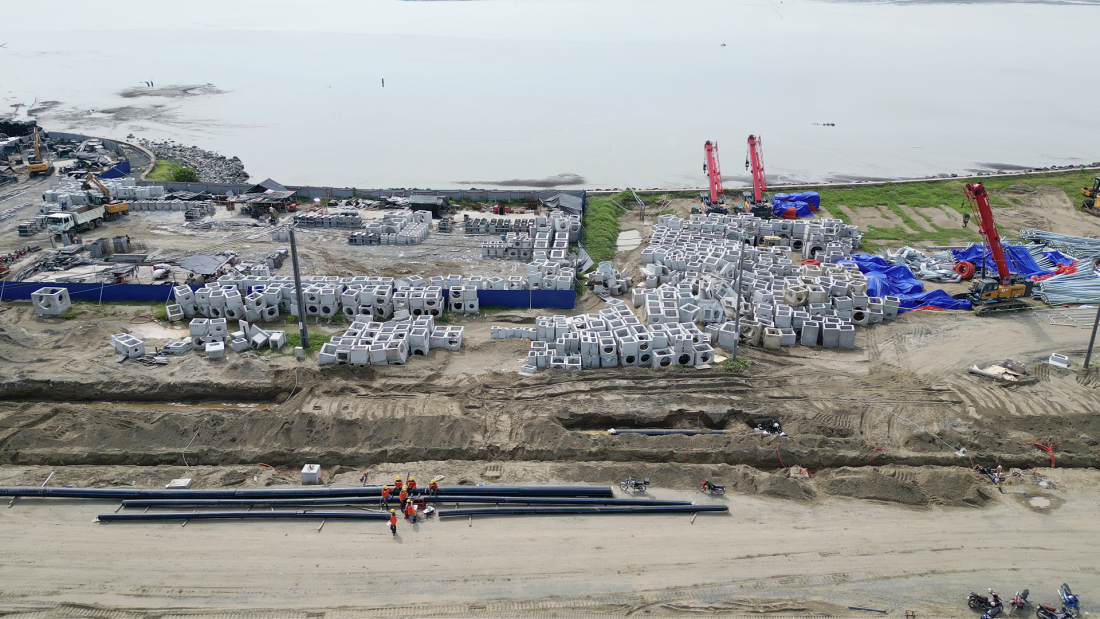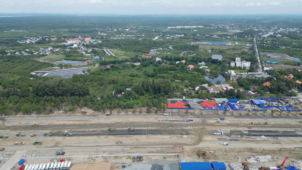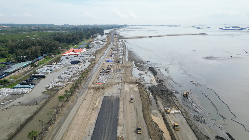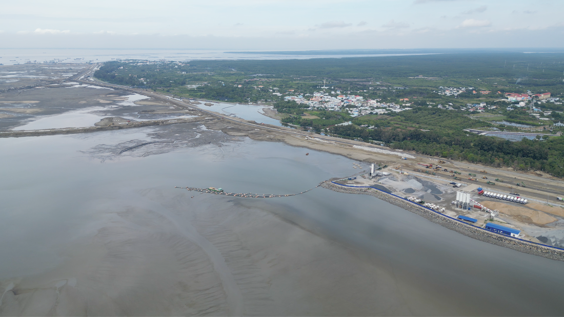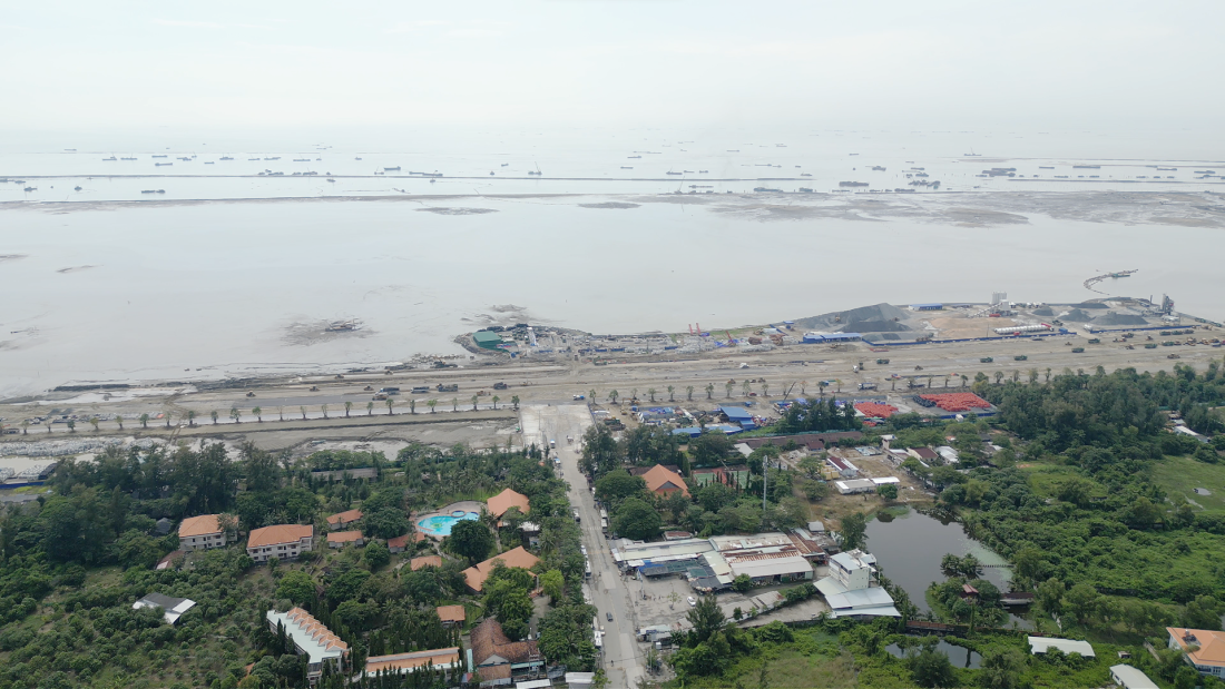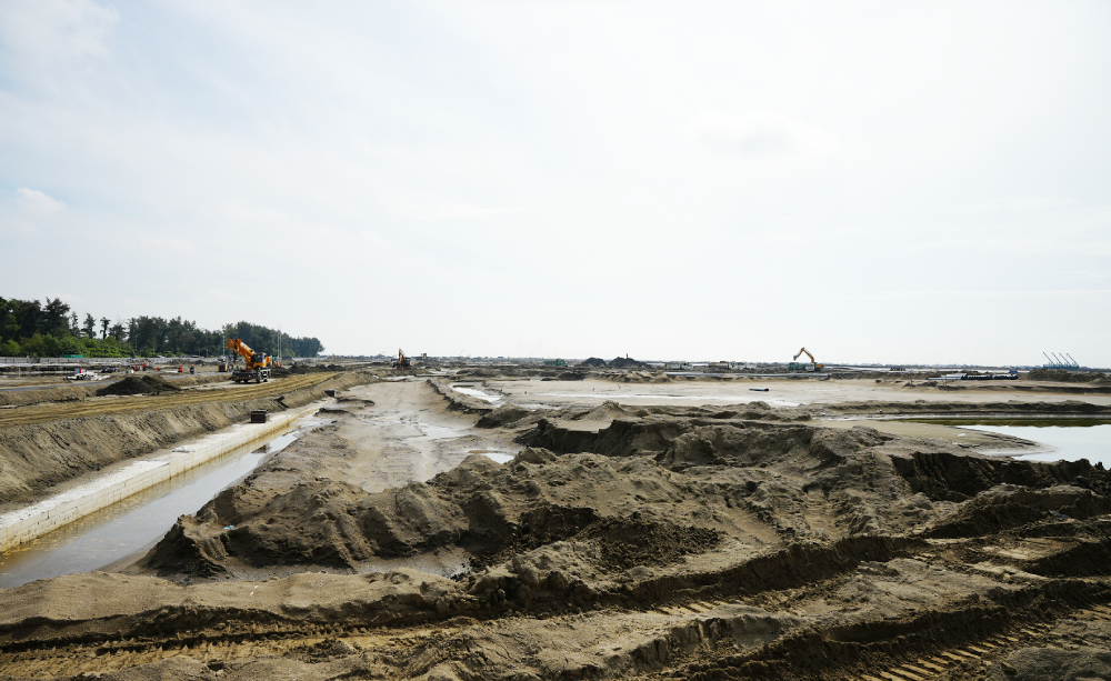 Tại khu vực giáp ranh giữa đất liền và vùng lấn biển, hệ thống đê bao, đường công vụ, bãi tập kết vật liệu cùng khu nhà điều hành thi công đã dần hiện hữu. Ngoài khơi, hàng chục tàu hút bùn, sà lan và cần cẩu chuyên dụng hoạt động liên tục, bơm cát tạo nền trên diện tích hàng trăm ha.