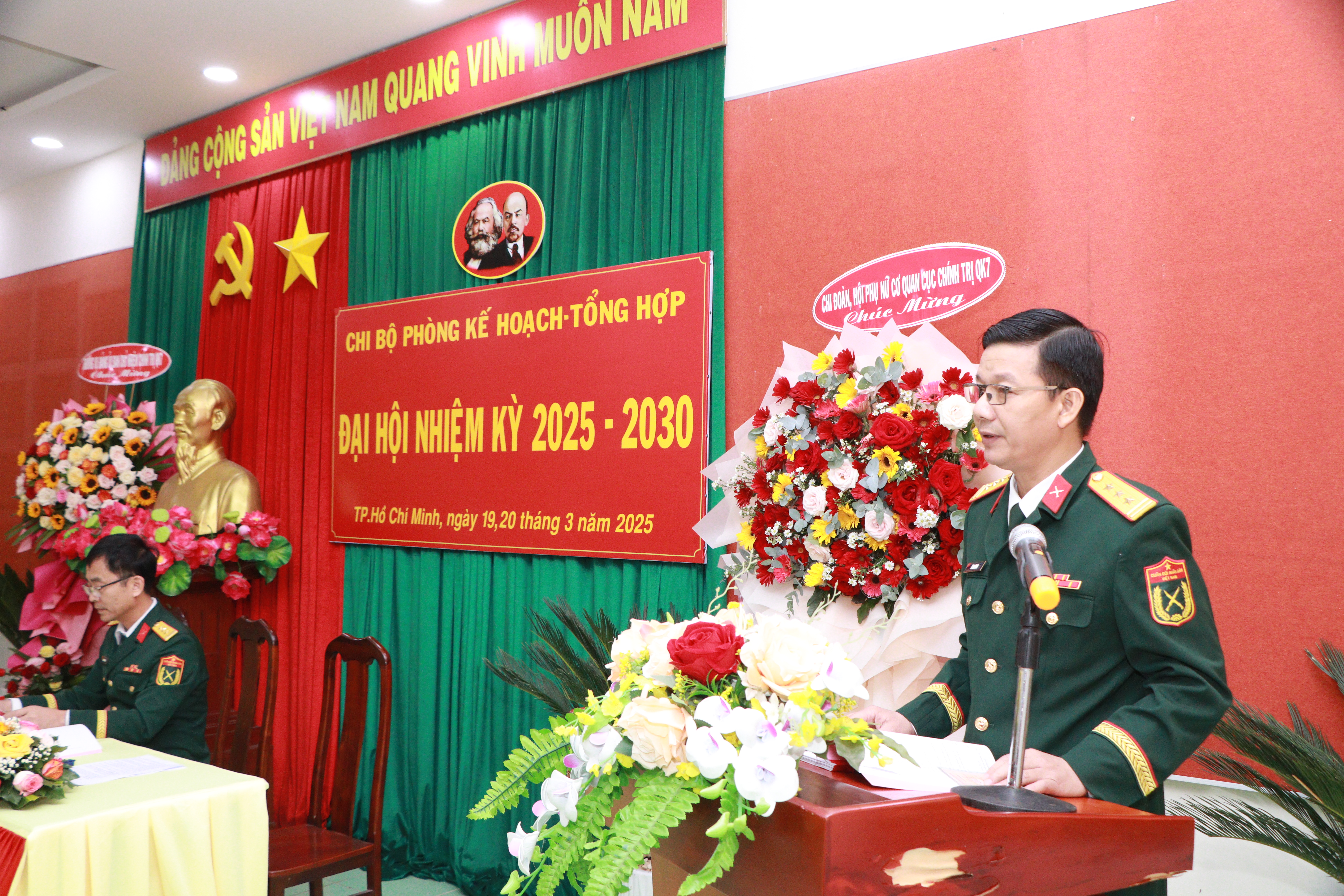 (QK7 Online) - Sáng ngày 20/3, Chi bộ Phòng Kế hoạch - Tổng hợp tổ chức Đại hội nhiệm kỳ 2025-2030. "Thành tích, kết quả của Đảng bộ, Cơ quan Cục Chính trị trong 5 năm qua, có đóng góp rất lớn của cán bộ, đảng viên Chi bộ Phòng Kế hoạch - Tổng hợp. Thường vụ Đảng ủy, Ban Chủ nhiệm Chính trị Quân khu đánh giá cao, ghi nhận và biểu dương sự nỗ lực cố gắng của các đồng chí" - Thiếu tướng Trần Chí Tâm, Bí thư Đảng ủy Cục Chính trị, Phó Chủ nhiệm Chính trị Quân khu phát biểu đánh giá tại Đại hội.
