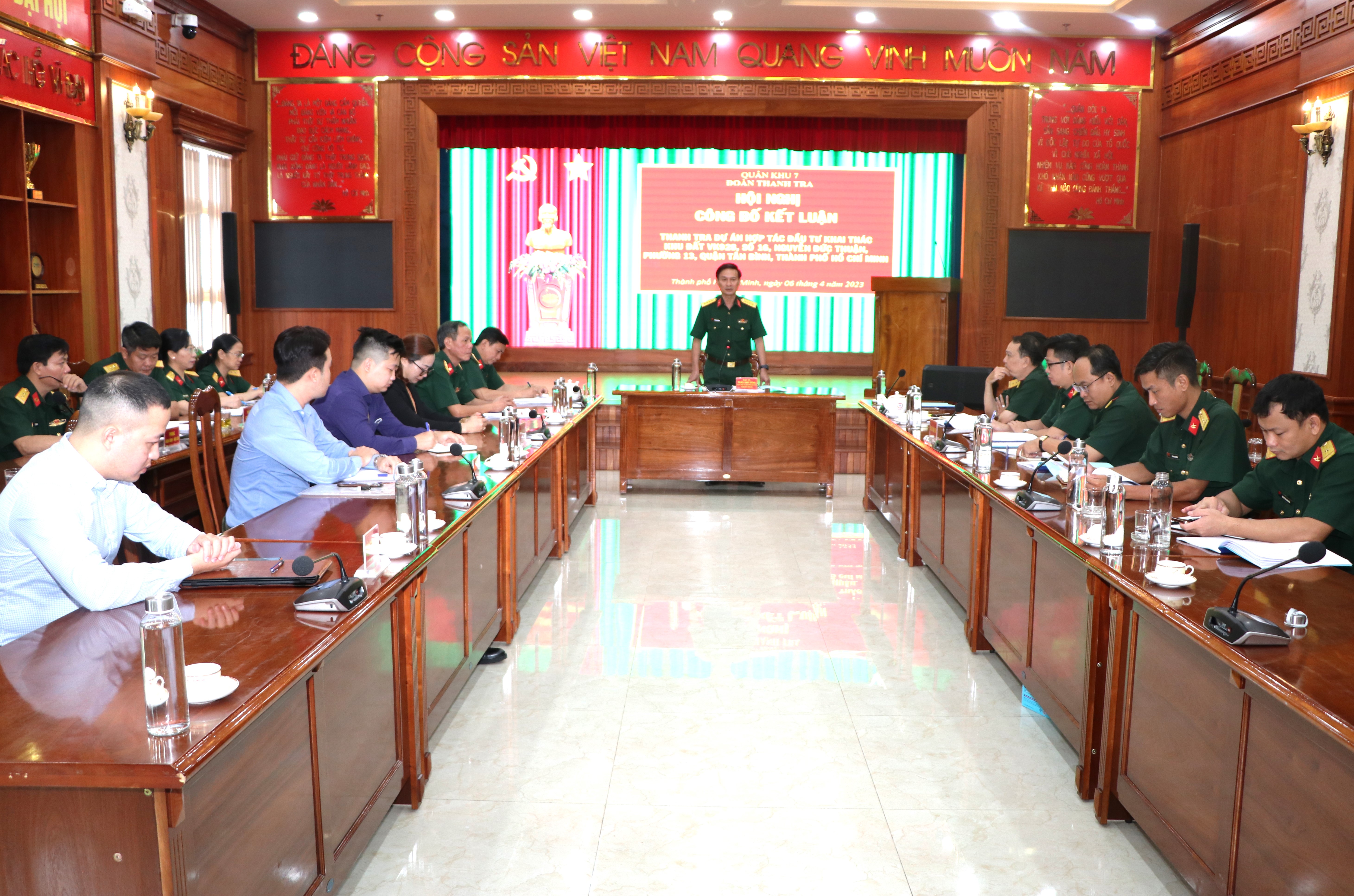 (QK7 Online) - Ngày 6/4, tại Công ty TNHH Một thành viên Đông Hải, Đoàn Thanh tra theo Quyết định số 2175/QĐ-QK của Tư lệnh Quân khu đã tiến hành công bố Kết luận thanh tra đối với Dự án hợp tác đầu tư khai thác khu đất VK928, số 16, Nguyễn Đức Thuận, Phường 13, quận Tân Bình, TPHCM. Đại tá Trần Anh Dũng, Chánh Thanh tra Quốc phòng Quân khu, Trưởng đoàn thanh tra chủ trì hội nghị, dự hội nghị có lãnh đạo công ty Đông Hải và các doanh nghiệp có liên quan.