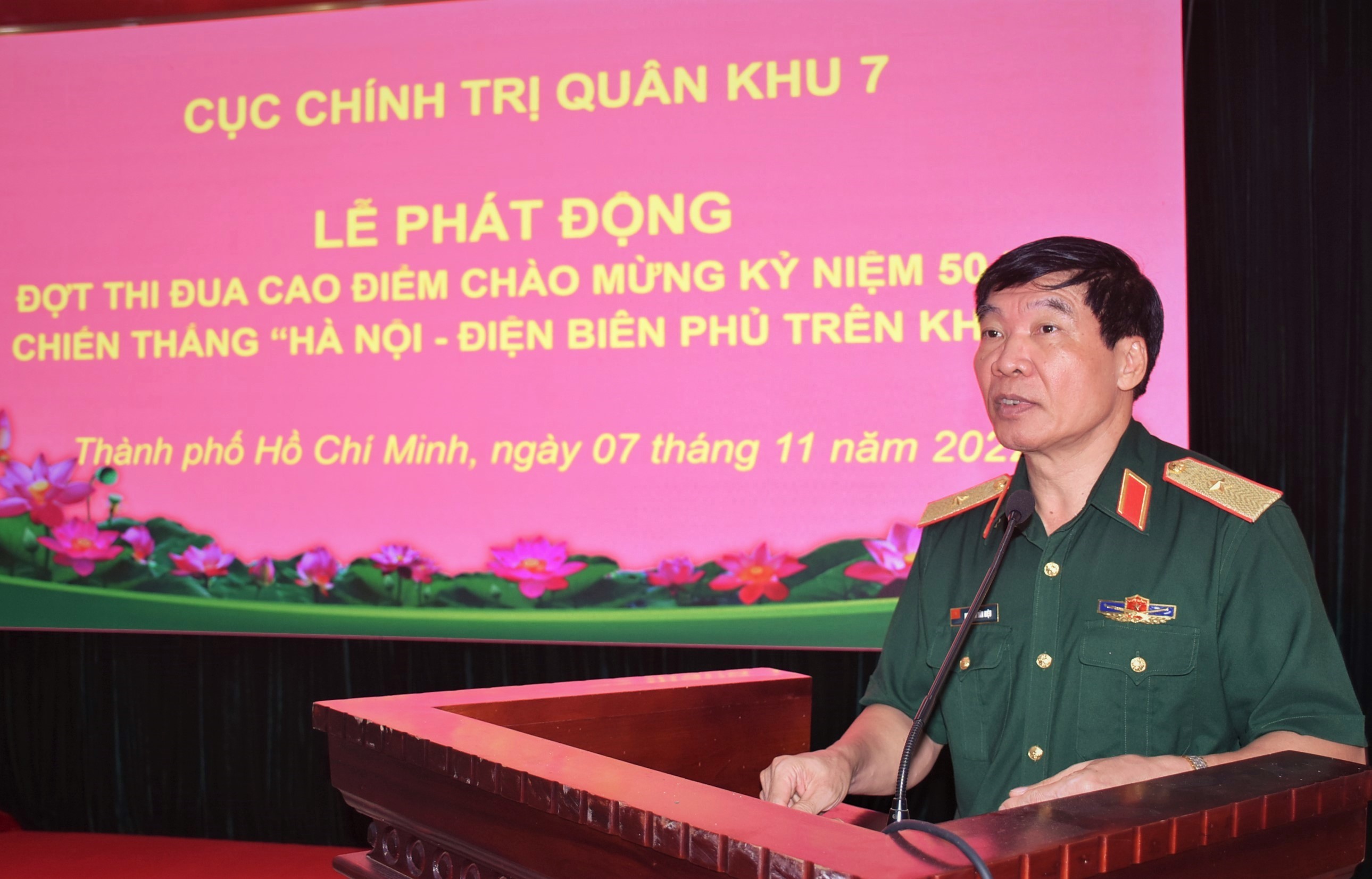 Thiếu tướng Nguyễn Văn Hiệu, Bí thư Đảng ủy Cục Chính trị, Phó Chủ nhiệm Chính trị Quân khu phát biểu tại lễ phát động thi đua.