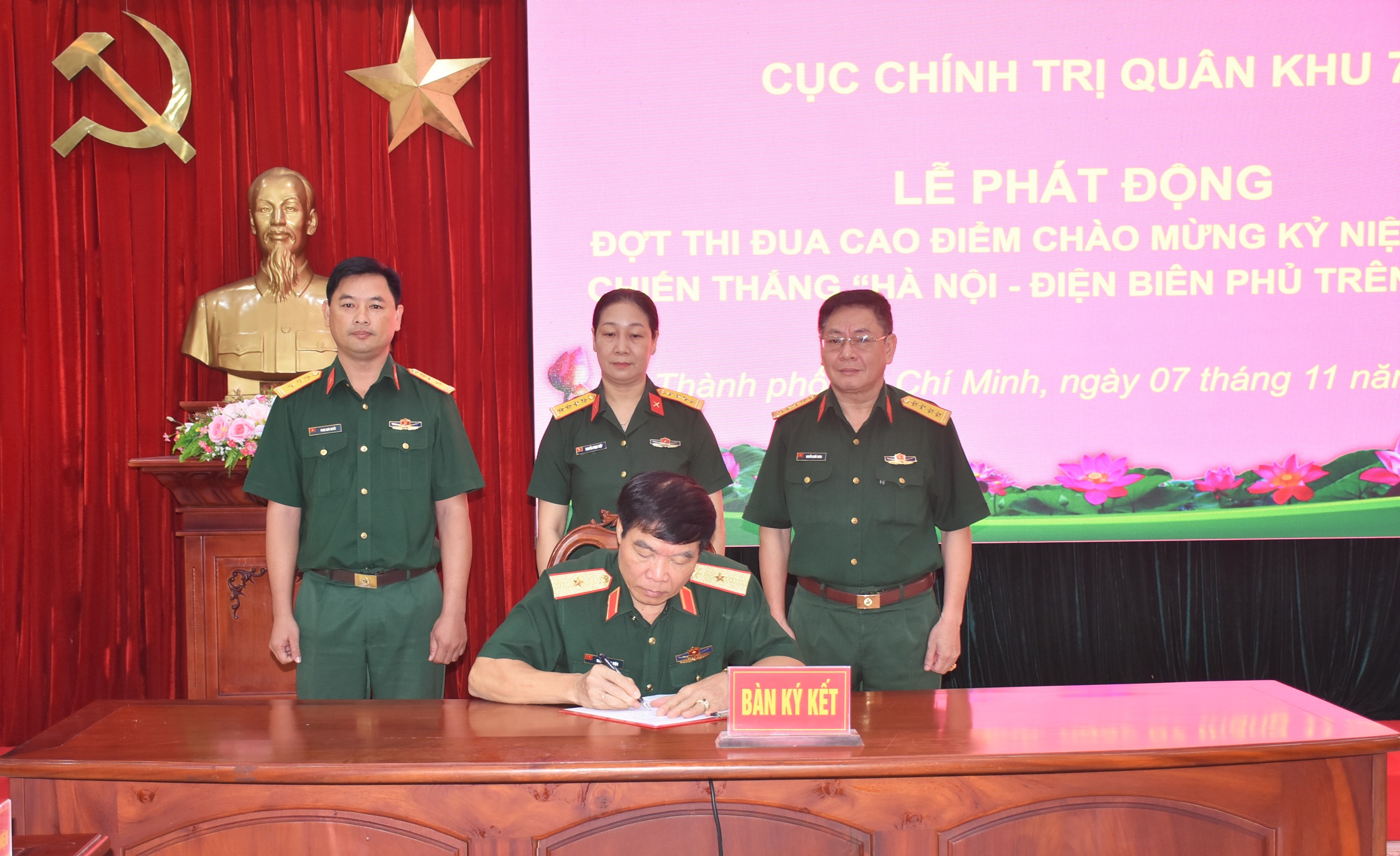 Thiếu tướng Nguyễn Văn Hiệu, Bí thư Đảng ủy Cục Chính trị, Phó Chủ nhiệm Chính trị Quân khu ký chứng kiến các khối ký kết thi đua.