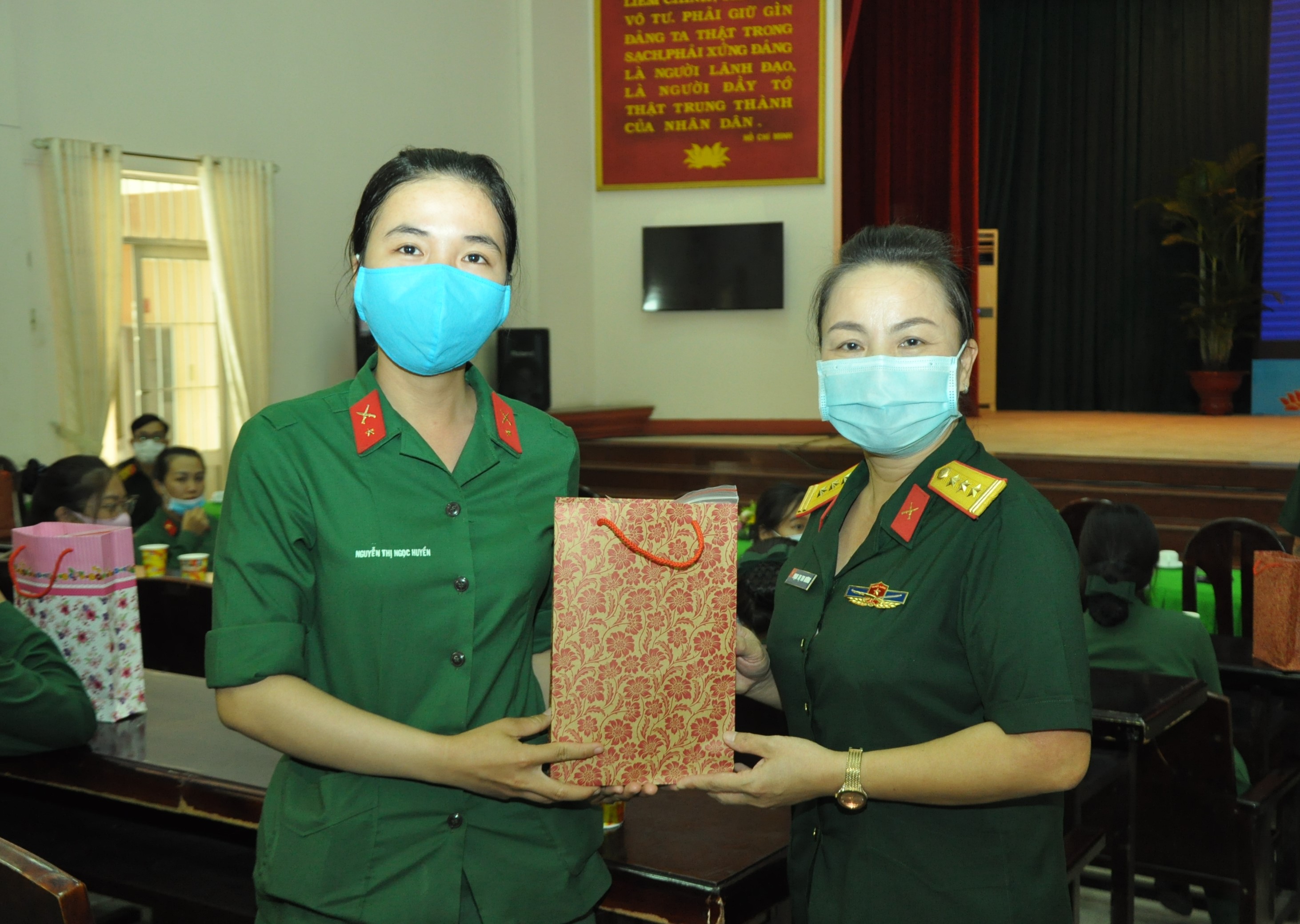 Thượng tá Phạm Thị Thu Hương, Trưởng Ban Phụ nữ Quân khu 7 tặng quà động viên nữ tân binh.