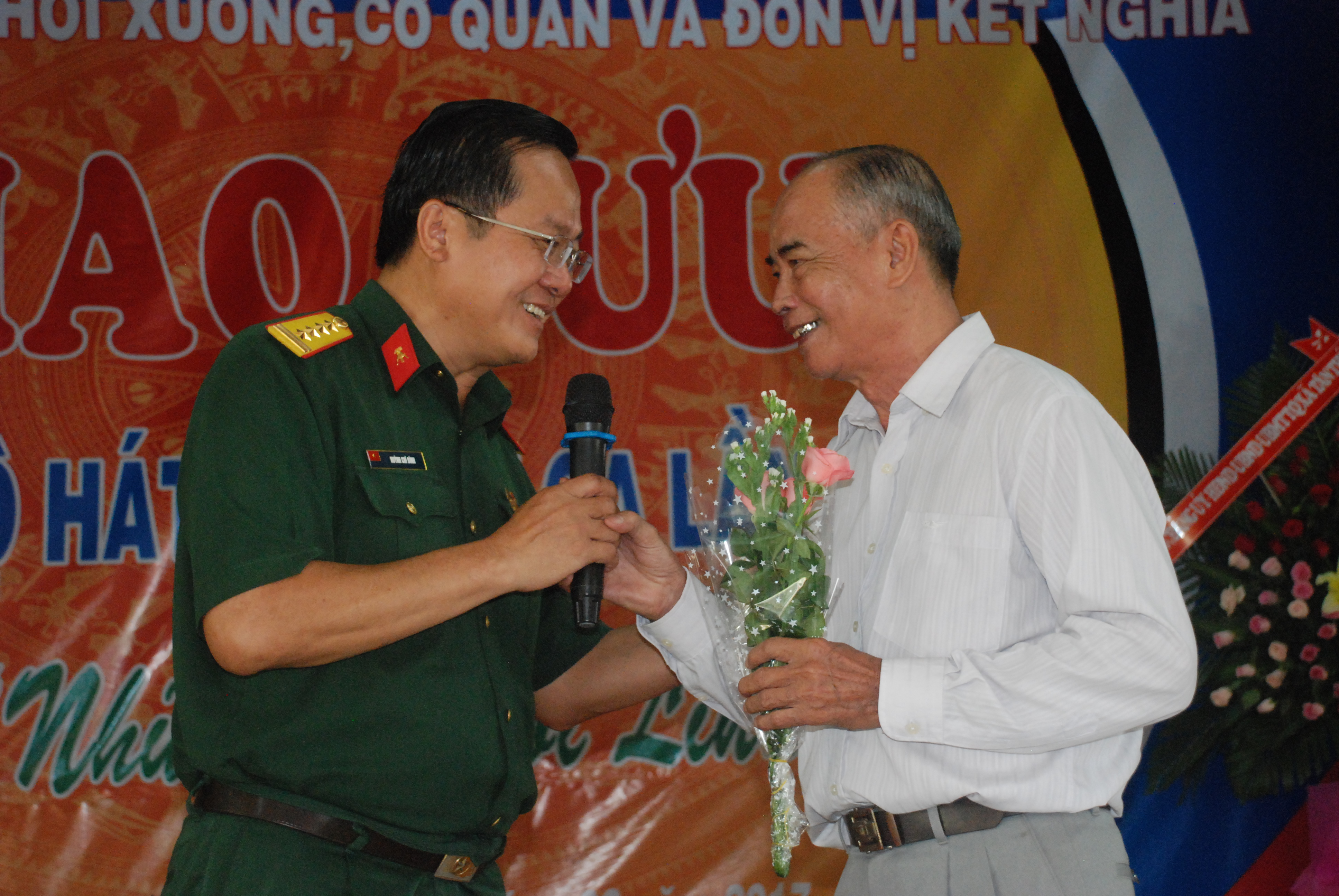 Đại tá Huỳnh Chí Bình tặng hoa cho tiết mục đơn ca vọng cổ đến từ đơn vị kết nghĩa