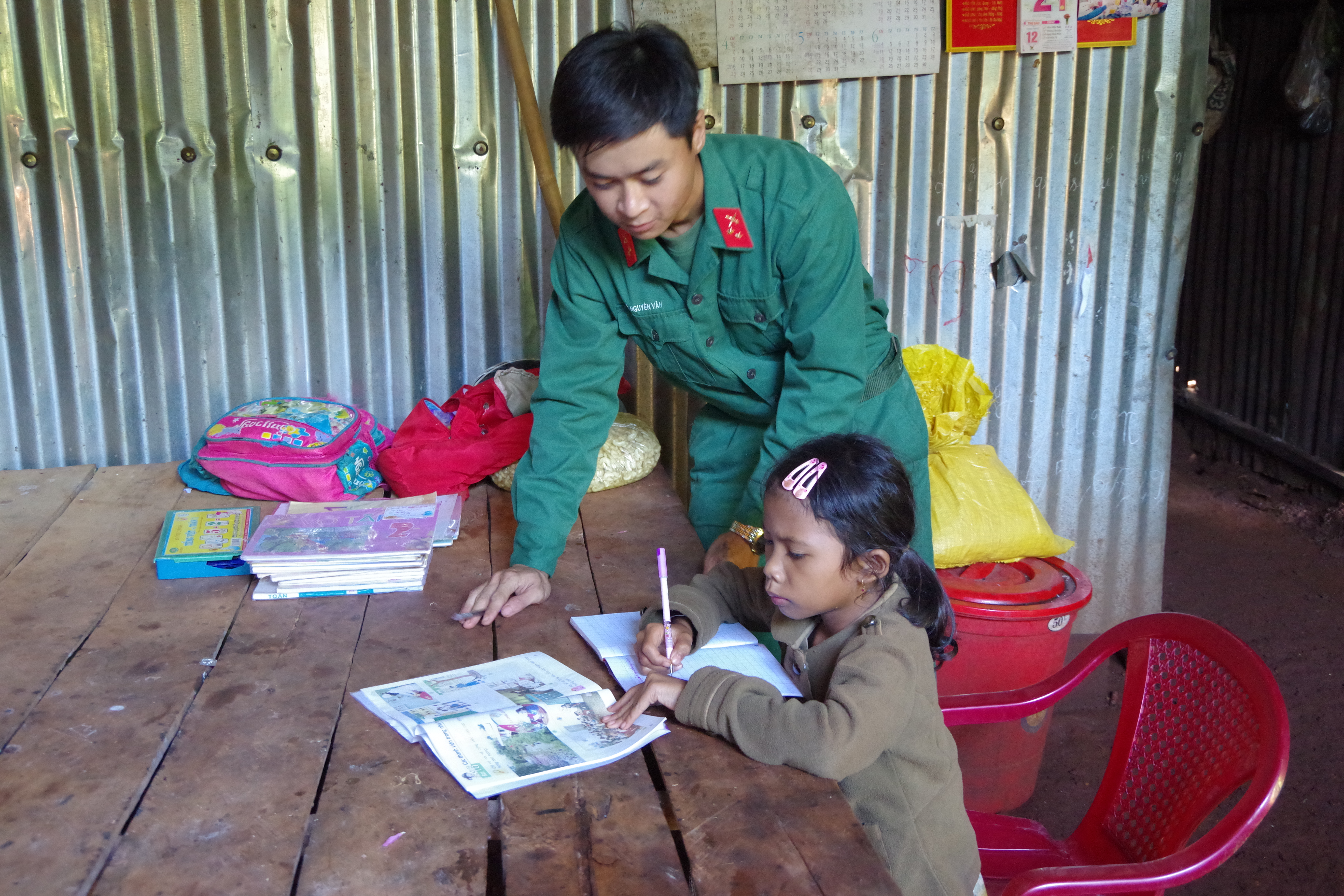 Được sự giới thiệu Ban Giám hiệu nhà trường, địa chỉ mà đơn vị nhận giúp đỡ là em Thị Bằng và Nguyễn Gia Bảo, cả 2 em đều trú tại thôn Hai Căn, xã Phú Nghĩa. Lúc mới triển hai thực hiện phong trào, đơn vị cũng gặp một số khó khăn như gia đình 2 em học sinh được đơn vị nhận hỗ trợ, giúp đỡ còn ngại, né tránh do mặc cảm; đơn vị đã chủ động cử cán bộ phối hợp cùng với giáo viên chủ nhiệm 2 em xuống tận gia đình động viên, vận động nhiều lần gia đình mới nhất trí tiếp tục cho con em mình tới trường. Theo đó, mỗi tháng cán bộ, chiến sĩ hỗ trợ 2 em một triệu đồng (500 ngàn đồng/1 em) kèm theo nhu yếu phẩm (nước mắm, gạo, rau xanh,…); để có tiền hỗ trợ 2 em, cán bộ chiến sĩ đã thực hiện tốt phong trào “thứ bảy tình nguyện”, thực hiện ngày “chủ nhật xanh” thu gom chai, lọ trong đơn vị bán cho cơ sở mua phế liệu vừa tạo môi trường cảnh quan đơn vị xanh, sạch, đẹp lại vừa có thêm nguồn thu; ngoài ra, đơn vị còn trích thêm một phần kinh phí từ quỹ tăng gia sản xuất để hỗ trợ các em học sinh.