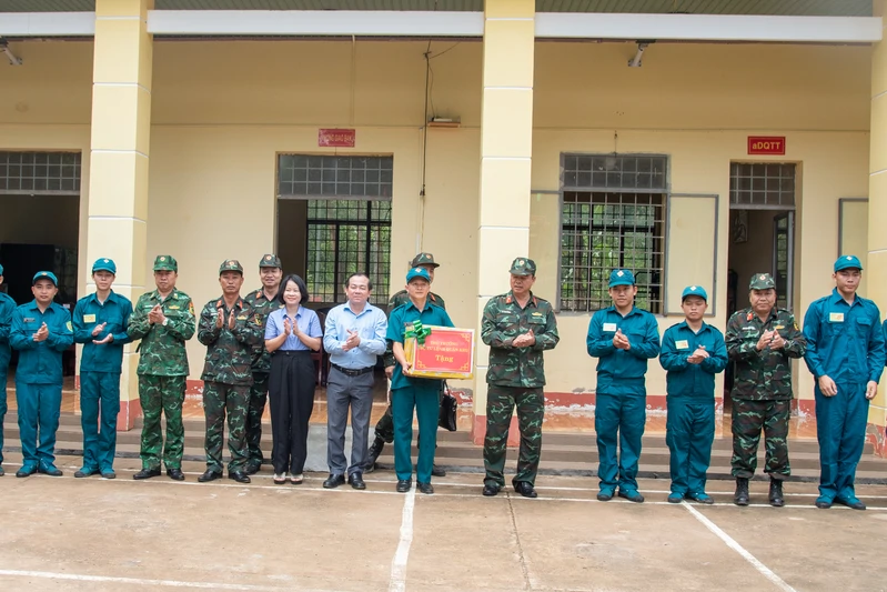 Đại tá Lê Xuân Bình cùng đoàn công tác tặng quà cho cán bộ, chiến sĩ chốt dân quân Phước Thiện.