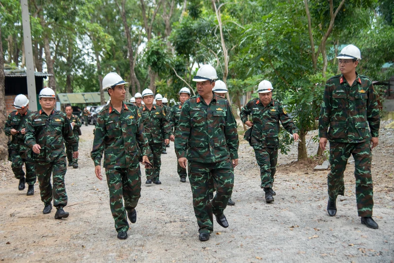 Đại tá Lê Xuân Bình cùng đoàn công tác thăm, kiểm tra công trình do Lữ đoàn 279, Binh chủng Công binh thi công tại tỉnh Tây Ninh.