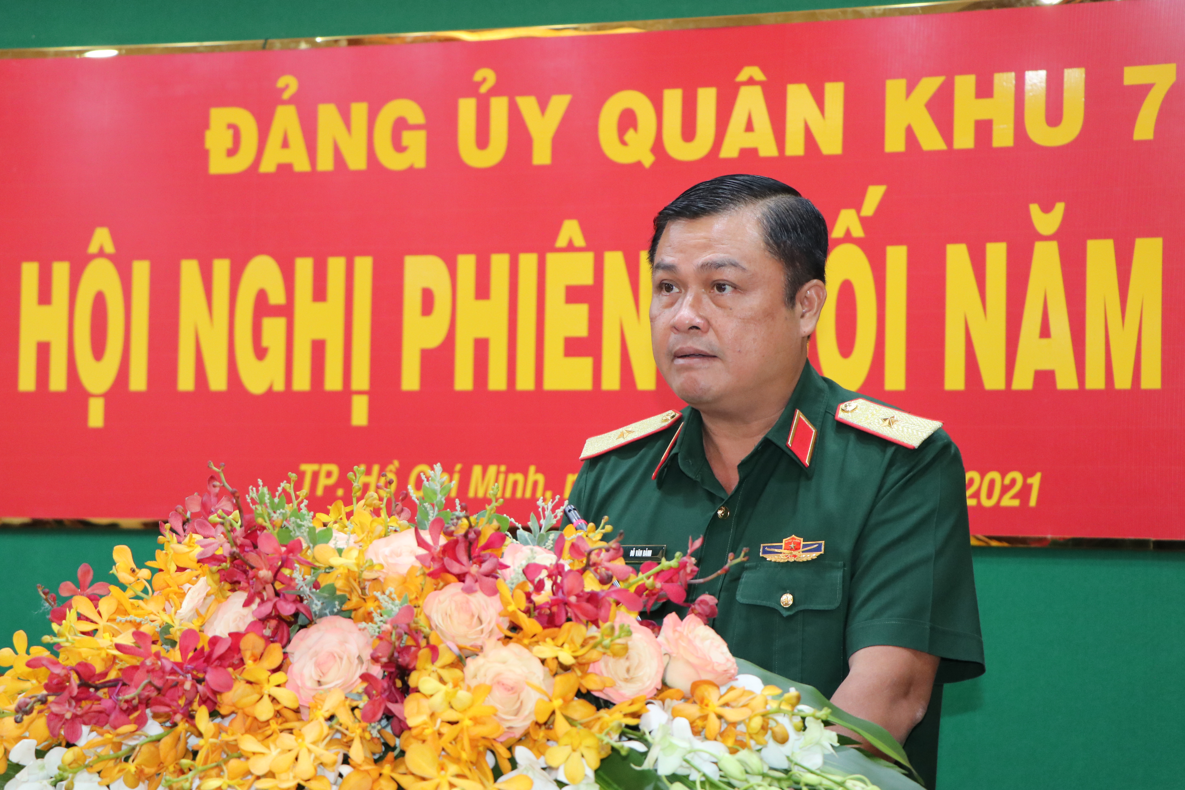 Thiếu tướng Đỗ Văn Bảnh, Phó Chính ủy Quân khu  báo cáo kết quả thực hiện nhiệm vụ quân sự, quốc phòng năm 2021, phương hướng, nhiệm vụ năm 2022.