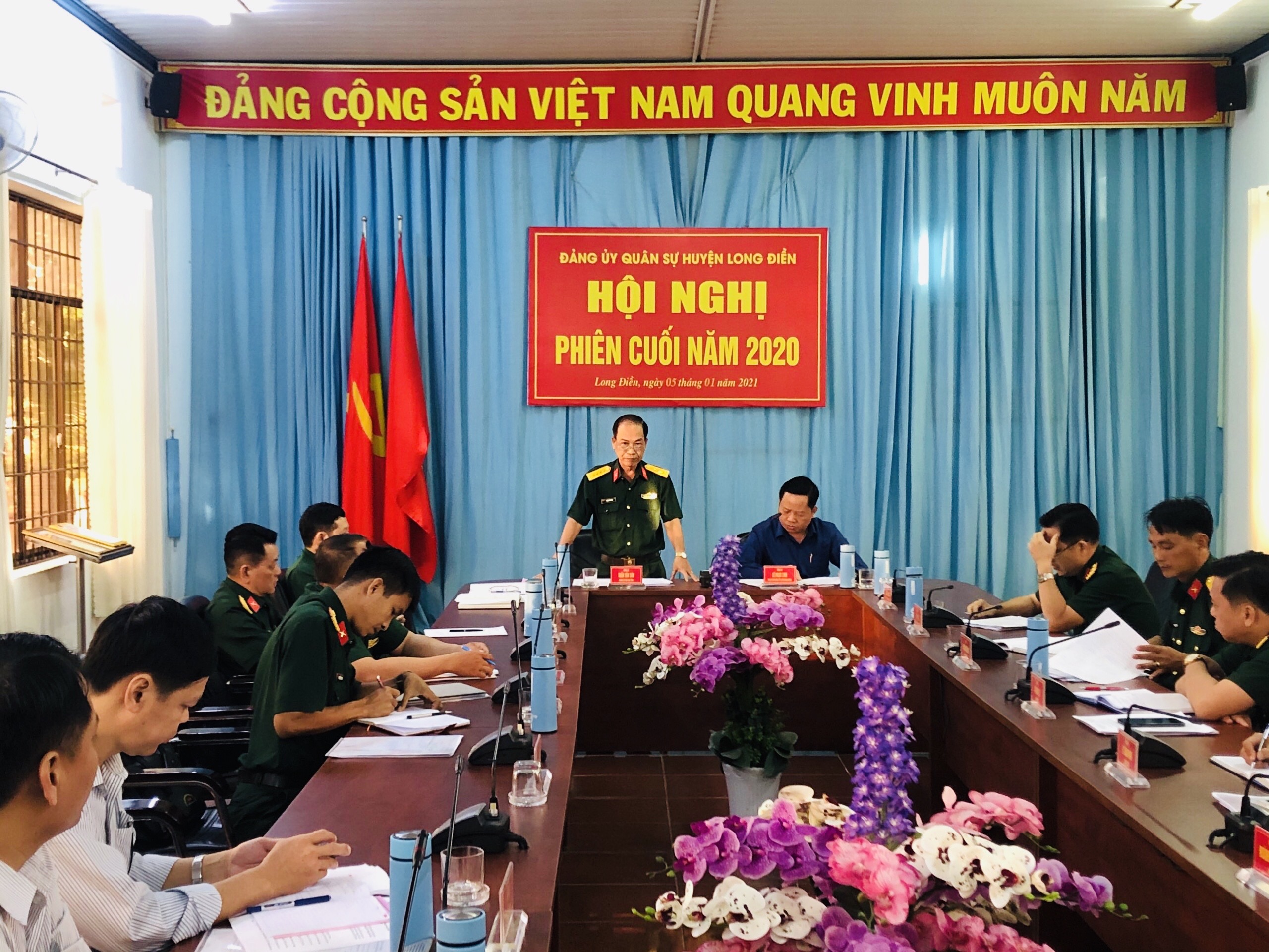 Kết luận hội nghị, đồng chí Lê Ngọc Linh, Bí thư Huyện ủy, Bí thư ĐUQS huyện yêu cầu trong thời gian tới cần duy trì nghiêm chế độ trực SSCĐ, nhất là trong các cao điểm; Thực hiện tốt công tác giáo dục, bồi dưỡng kiến thức QP, AN cho các đối tượng; Công tác tuyển quân đạt 100% ở cả 2 cấp, trong đó có 1% đảng viên chính thức nhập ngũ. Nhiệm vụ trước mắt là chuẩn bị tốt cho hội trại tòng quân, lễ giao nhận quân, đón quân nhân xuất ngũ trở về địa phương; tổ chức các hoạt động kỷ niệm 91 năm Ngày thành lập Đảng CSVN; 75 năm Ngày truyền thống LLVT tỉnh và các hoạt động “Mừng Đảng, mừng Xuân”, đón Tết cổ truyền của dân tộc vui tươi, lành mạnh, an toàn, tiết kiệm và SSCĐ cao.