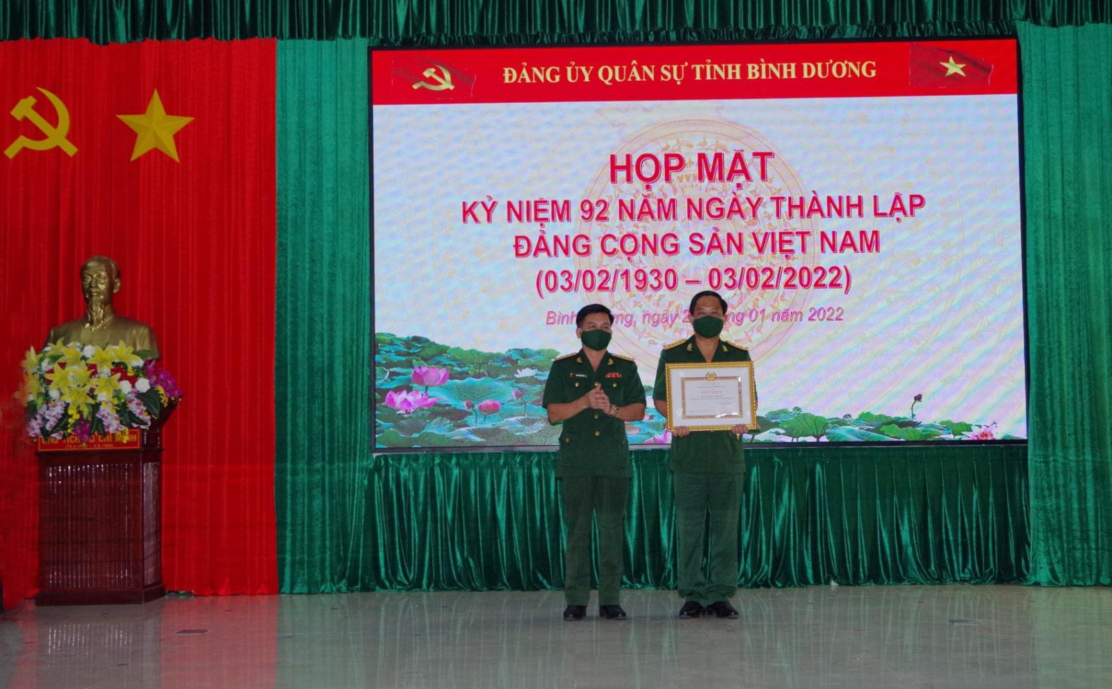 Dịp này, Đảng ủy Quân sự tỉnh trao huy hiệu 30 năm tuổi Đảng cho 2 đồng chí và tặng giấy khen của Đảng ủy Quân sự tỉnh cho tổ chức Đảng “hoàn thành xuất sắc nhiệm vụ” tiêu biểu năm 2021.