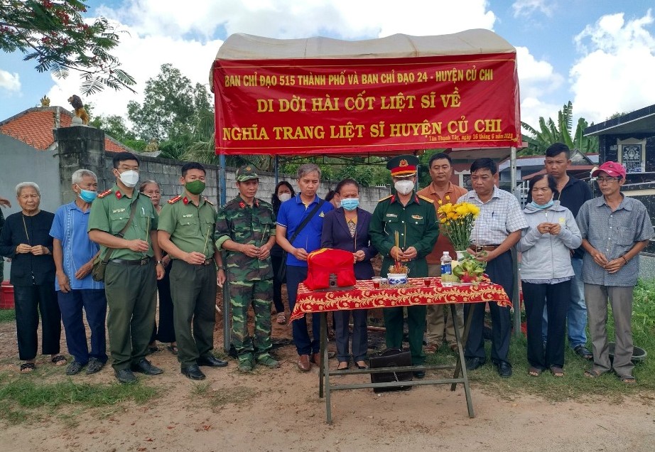 (QK7 Online) - Ngày 16-6, Ban chỉ đạo 24 huyện Củ Chi và Hội đồng Chính sách xã Tân Thạnh Tây phối hợp Tổ công tác Ban chỉ đạo 515 Thành phố Hồ Chí Minh tiến hành di dời hài cốt liệt sĩ Võ Văn Dứa về Nghĩa trang liệt sĩ huyện Củ Chi tại xã An Nhơn Tây, huyện Củ Chi, Thành phố Hồ Chí Minh.