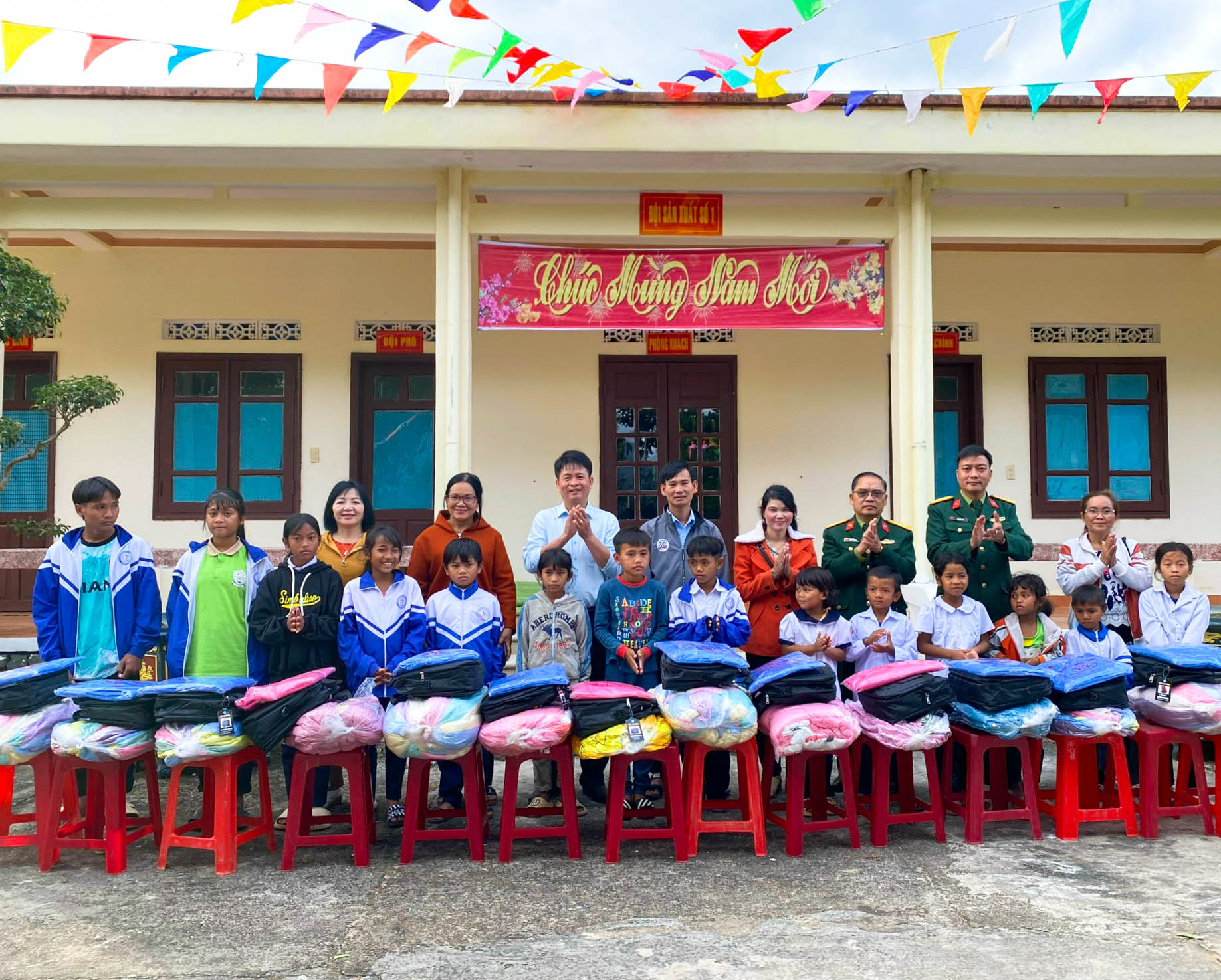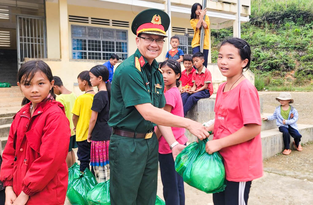Trung tá Nguyễn Trọng Thúy, Chính trị viên Đoàn KTQP Lâm Đồng tặng quà cho các em học sinh.